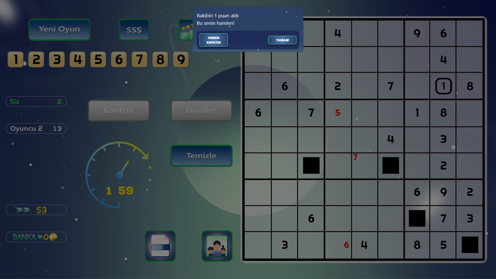 • Uyum Yasası: Her satır, sütun ve 3x3 kare, tüm sayıların benzersiz olması gereken kutsal bir alandır. Hareketiniz yanlışsa, hücrede küçük kırmızı bir sayı görünecektir — bu, her iki oyuncunun da göreceği bir hata işaretidir. Böyle bir hareket için puan almazsınız.