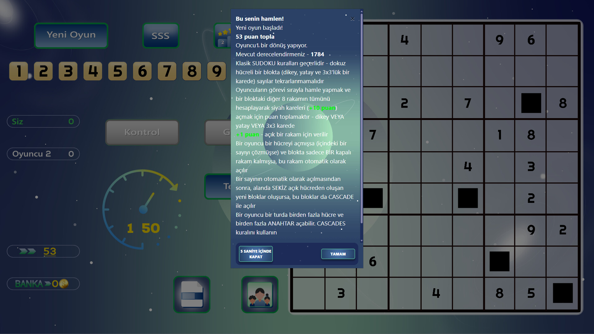 • Bahisler ve Zafer: Oyun başlamadan önce, her biriniz SUDOKU jetonlarınızla eşit miktarda bahis yapar ve ortak bir banka oluşturursunuz. Kazanan hepsini alır!