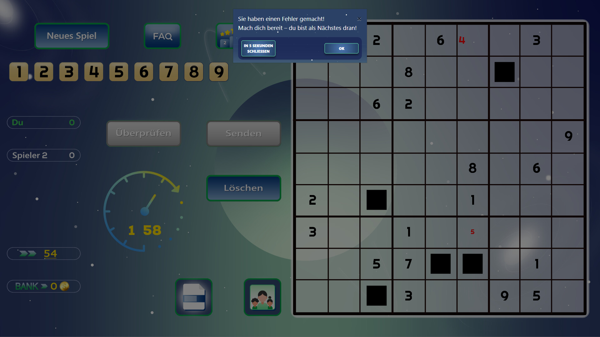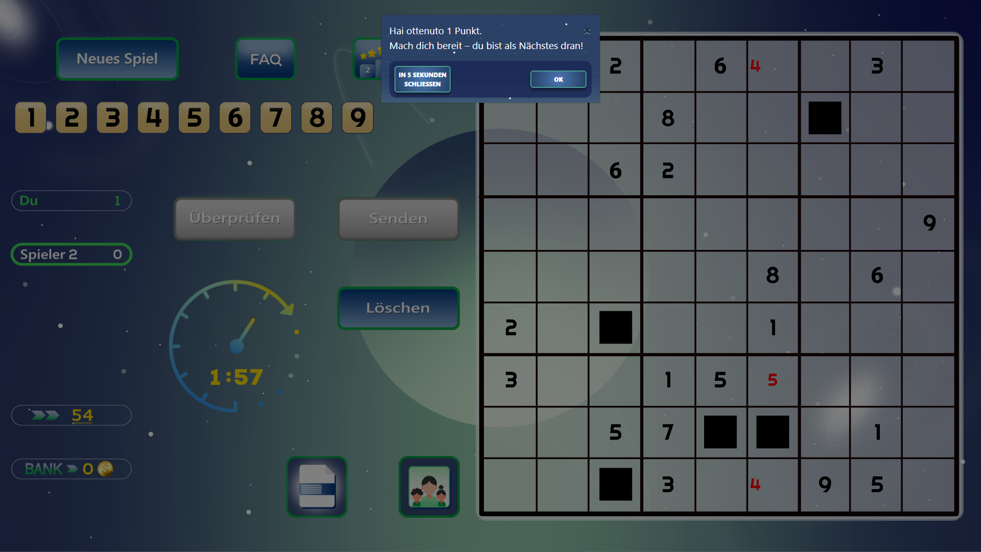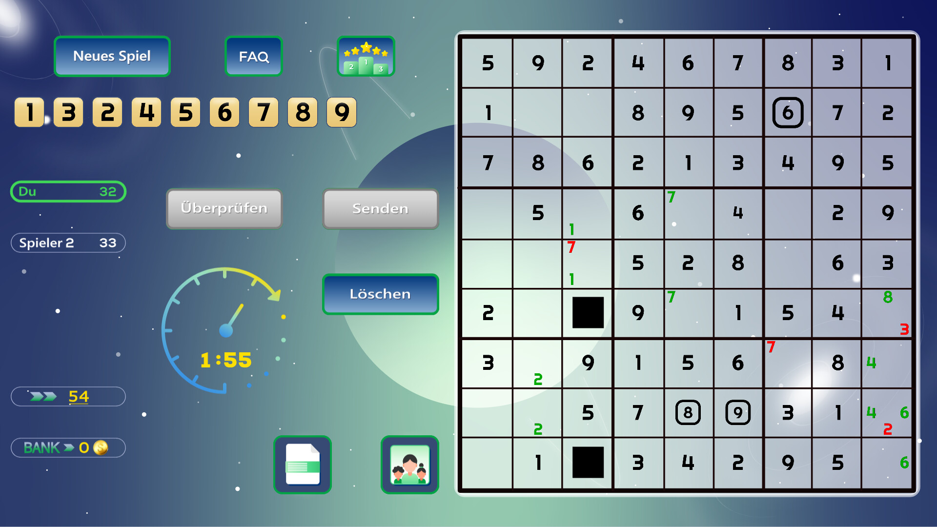 • Wetten und Sieg: Bevor das Spiel beginnt, setzt jeder von euch einen gleichen Einsatz mit seinen SUDOKU-Münzen und bildet so eine gemeinsame Bank. Der Gewinner bekommt alles!