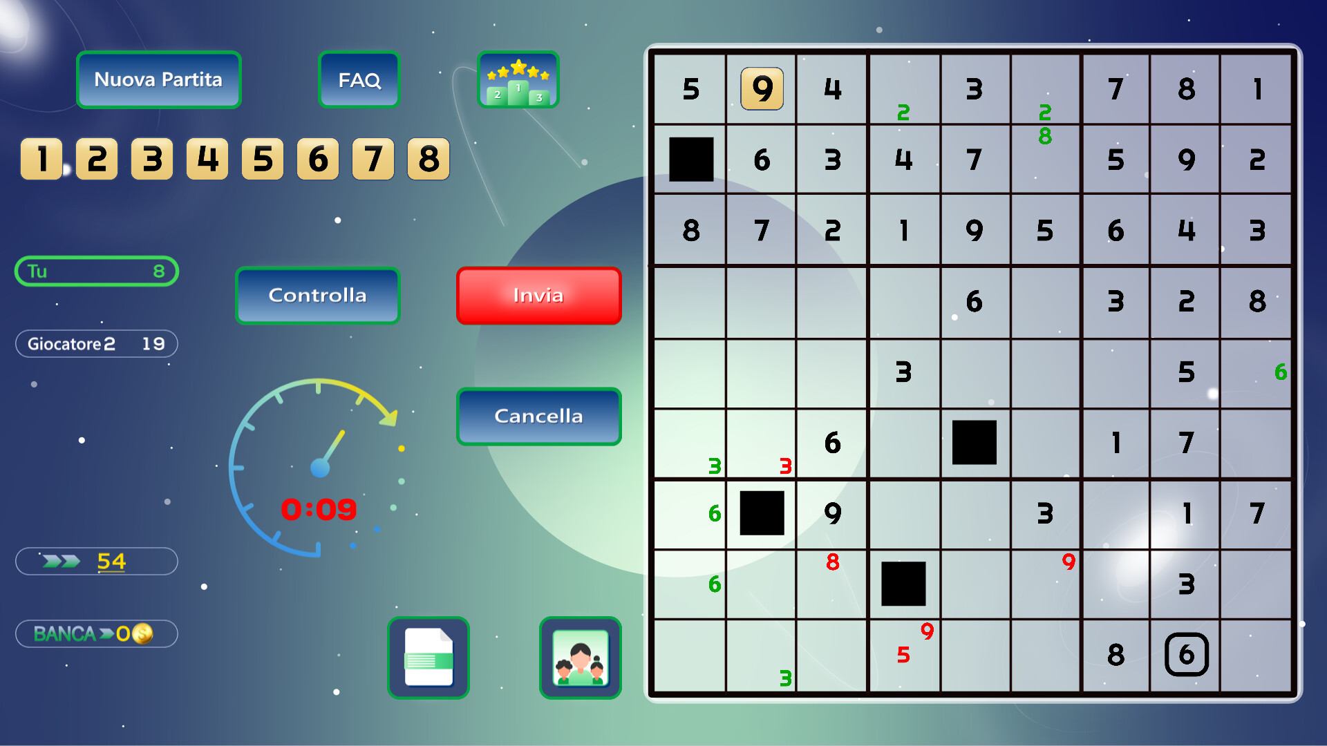 • La legge dell'armonia: ogni riga, colonna e quadrato 3x3 è uno spazio sacro in cui tutti i numeri devono essere unici. Se la tua mossa è errata, nella casella apparirà un piccolo numero rosso, un segno di errore visibile a entrambi i giocatori. Non riceverai alcun punto per tale mossa.