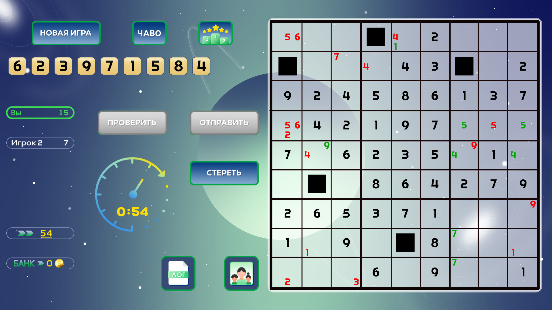 • Ловушки и подсказки: Будьте осторожны! Если вы совершите ошибку и поставите неверную цифру, на этом месте появится маленькая, пугающе красная метка. Она будет видна обоим искателям, и больше никто из соперников не сможет поставить такую цифру это место. Но у вас есть и тайное оружие — пометки. С помощью волшебной кнопки "Проверить" вы можете поставить маленькие зелёные цифры в ячейки - это ваши личные догадки или уверенные выводы. Эти заметки будут невидимы для вашего соперника, что поможет вам перехитрить его.