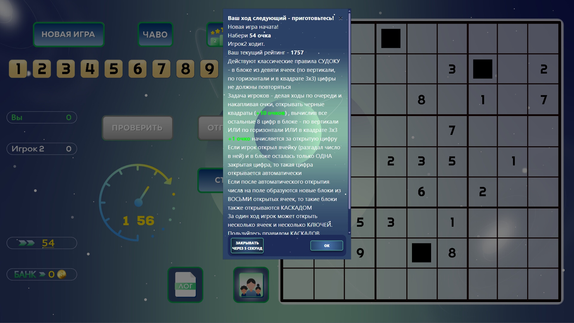 Ваша задача — путешествовать по великому Полю Девяти Девяток, где каждый ход — это шаг к победе, а каждая разгаданная цифра — драгоценная монета. Вы и противник поочередно совершаете ходы, стремясь заполнить поле быстрее и точнее своего оппонента.