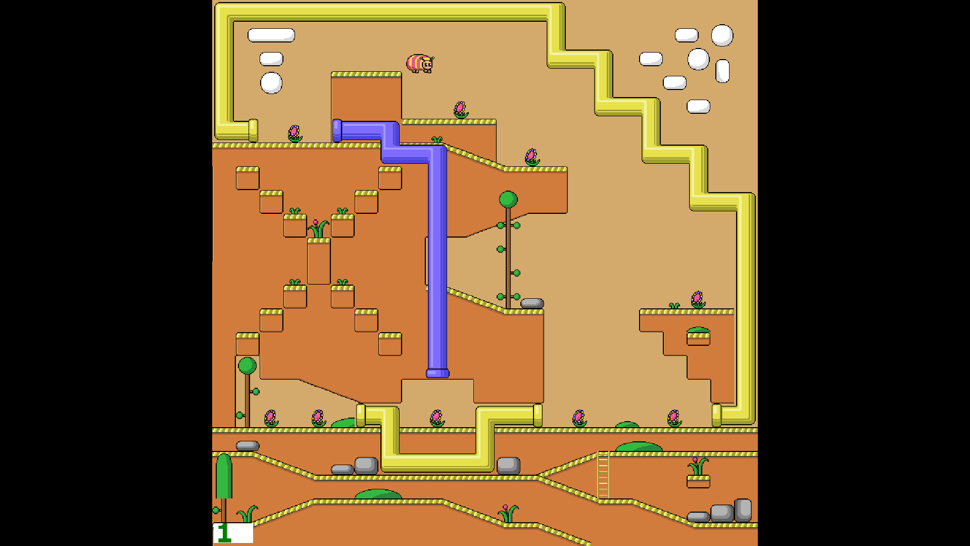 As usual, the caterpillar can't jump on its own. It can fly from place to place like a butterfly, bouncing off various game objects in its path. It also moves around the level on pipes.