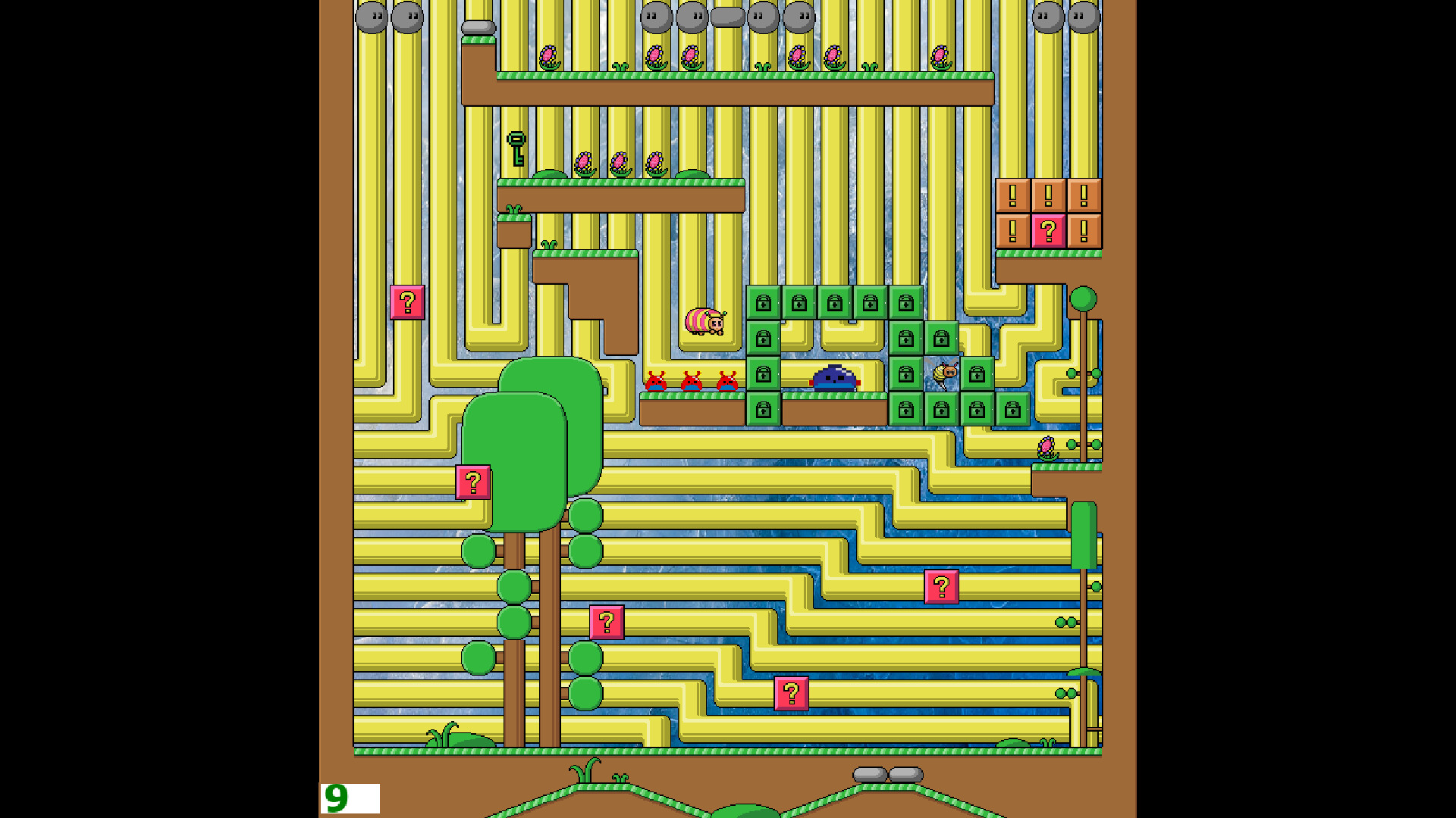 As usual, the caterpillar can't jump on its own. It can fly from place to place like a butterfly, bouncing off various game objects in its path. It also moves around the level on pipes.