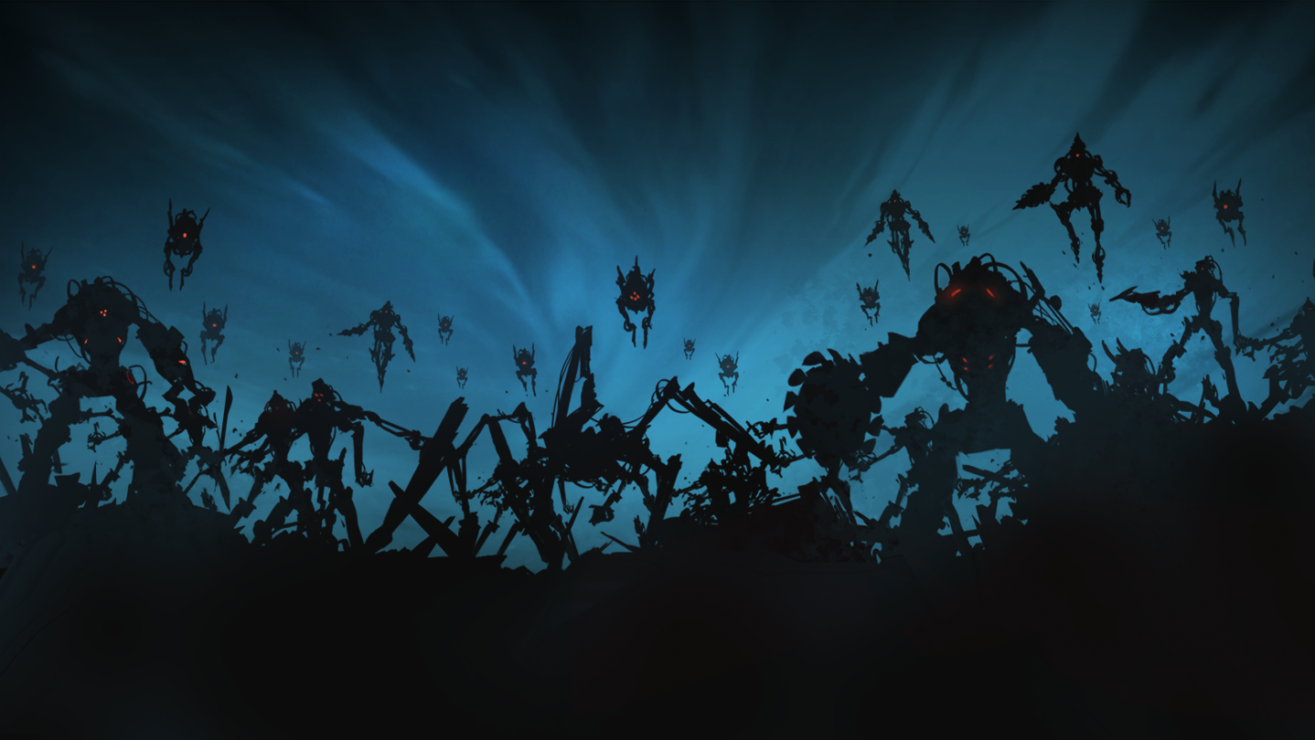 A world where AI legions dominate the surface and humanity hides below. Experience a hardboiled narrative of a lone machine fighting for mankind, brought to life with silhouette visuals and a stark sci-fi art style.