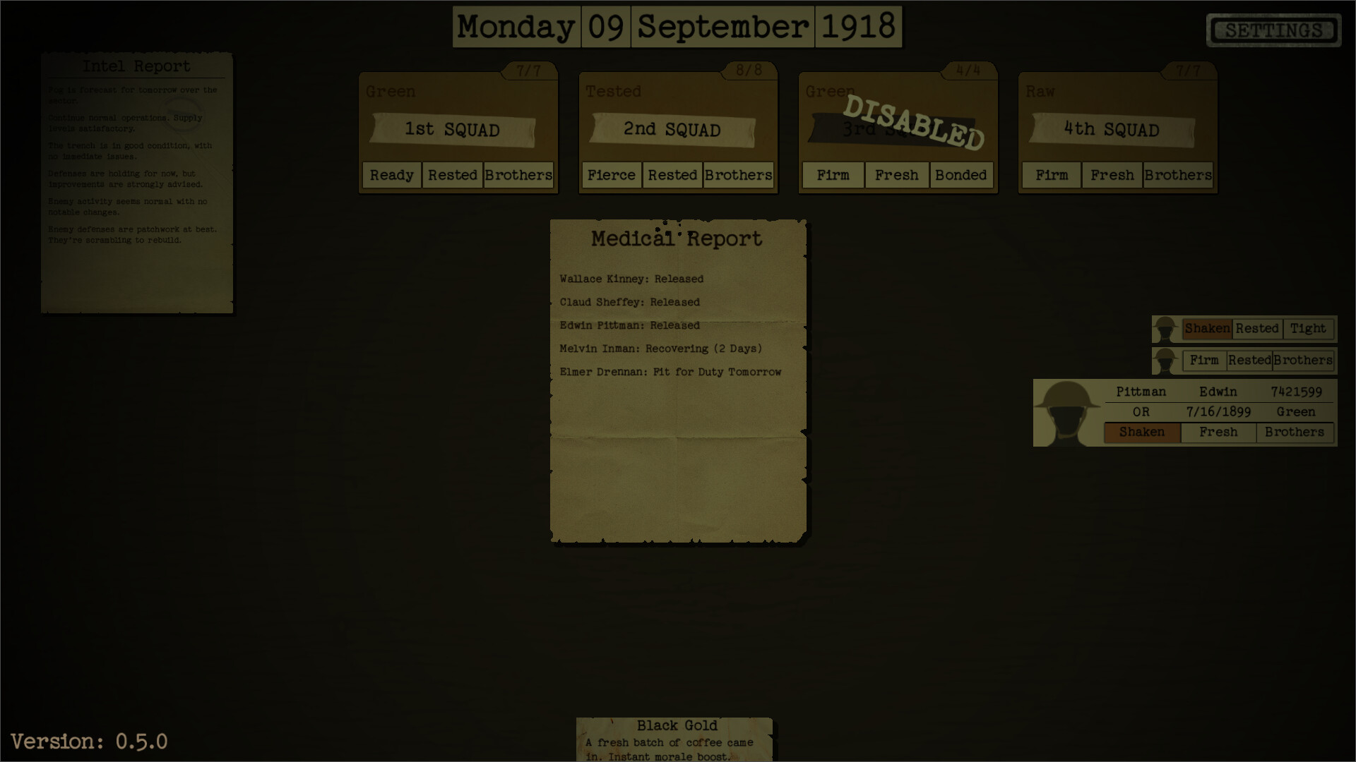 Each day brings new orders. Assign squads to patrols, trench repairs, or suicidal assaults. At night, manage the incoming paperwork. Read incident reports, check medical updates, scan intel briefings, and hope for reinforcements.