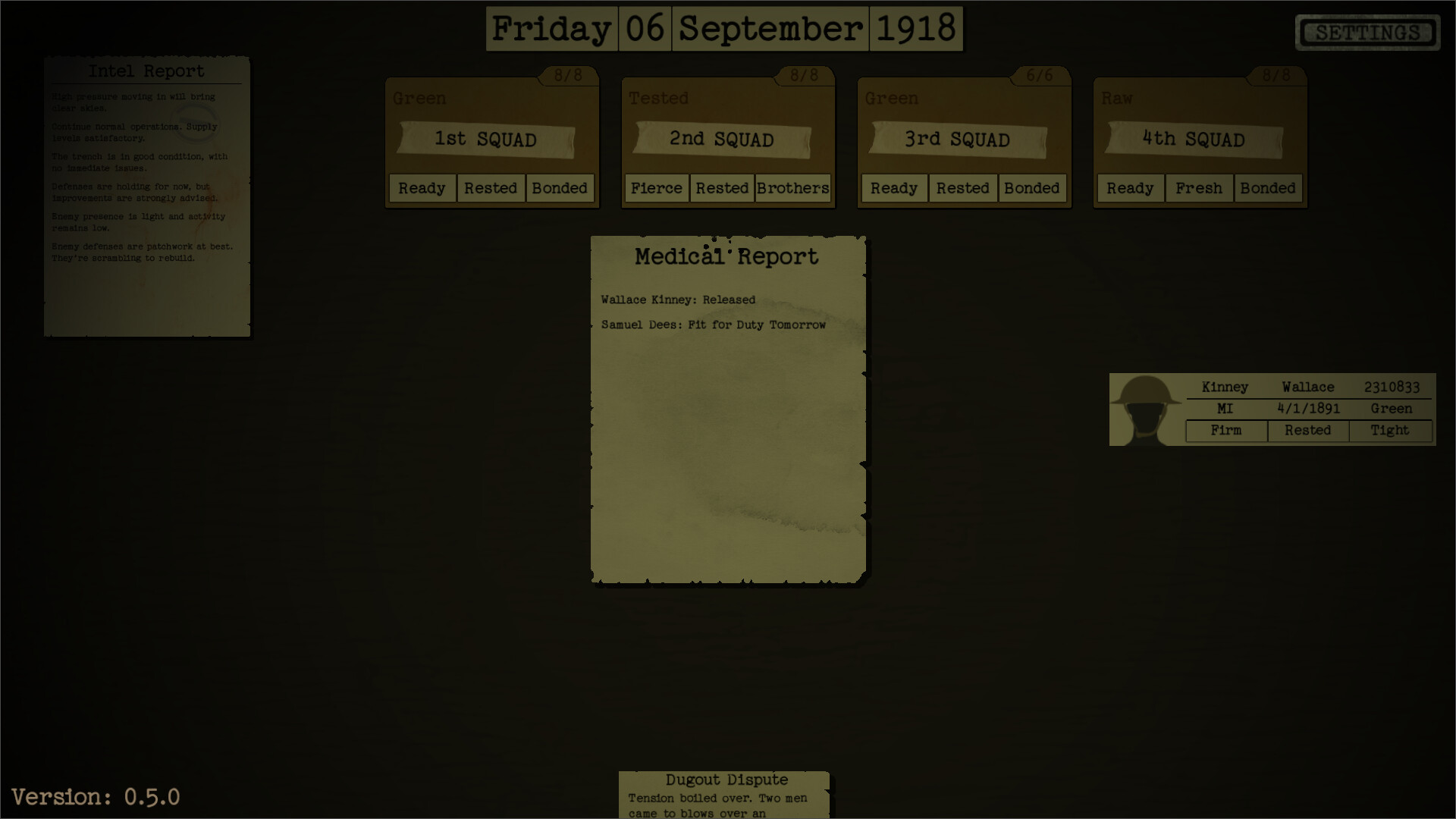Acceptable Losses DEMO is a phase-based WWI management game. Assign squads to missions, face random events, and manage the endless paperwork of war. Navigate morale, fatigue, and cohesion across a brutal 10-day trench campaign.
