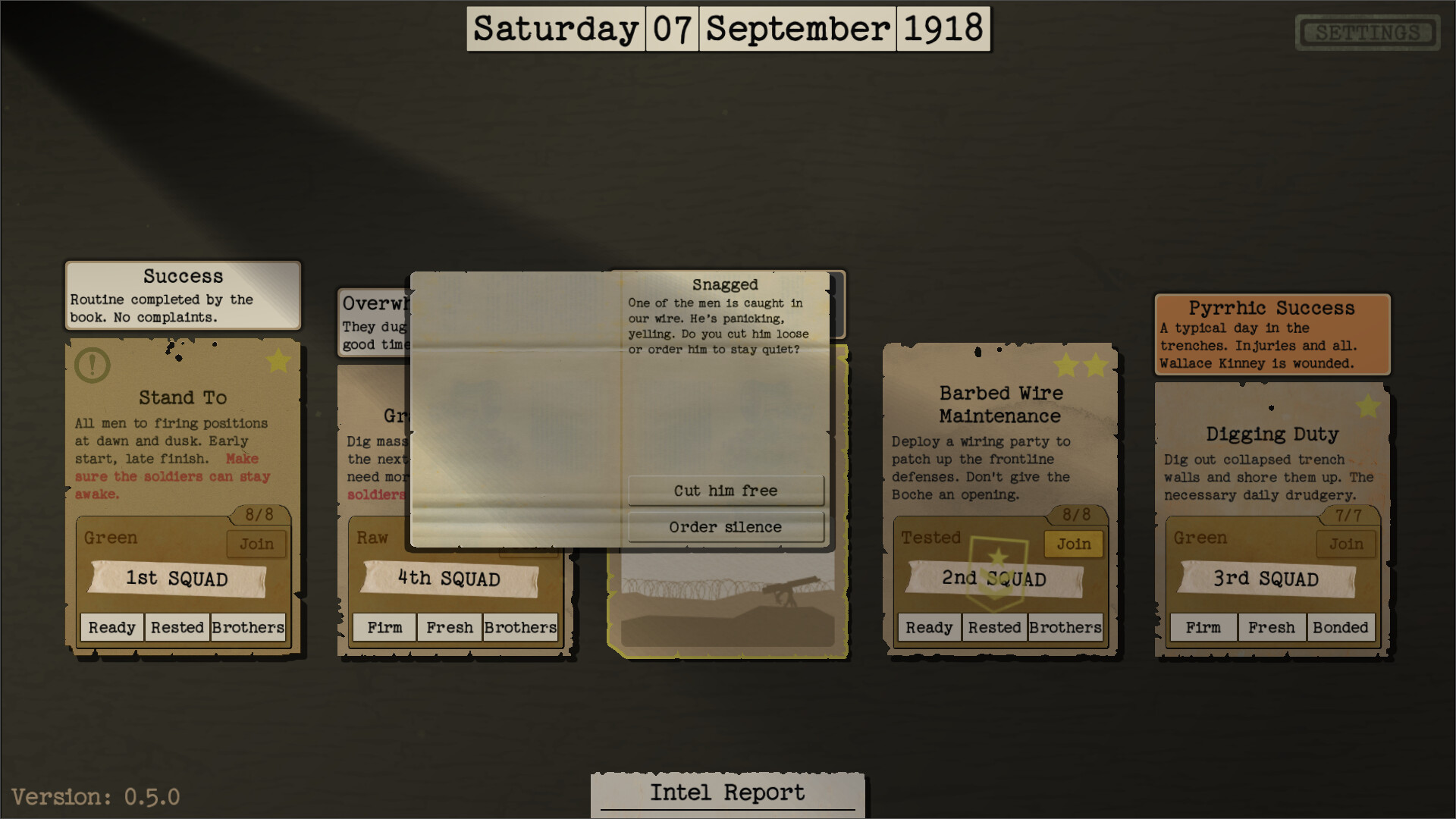 Each day brings new orders. Assign squads to patrols, trench repairs, or suicidal assaults. At night, manage the incoming paperwork. Read incident reports, check medical updates, scan intel briefings, and hope for reinforcements.