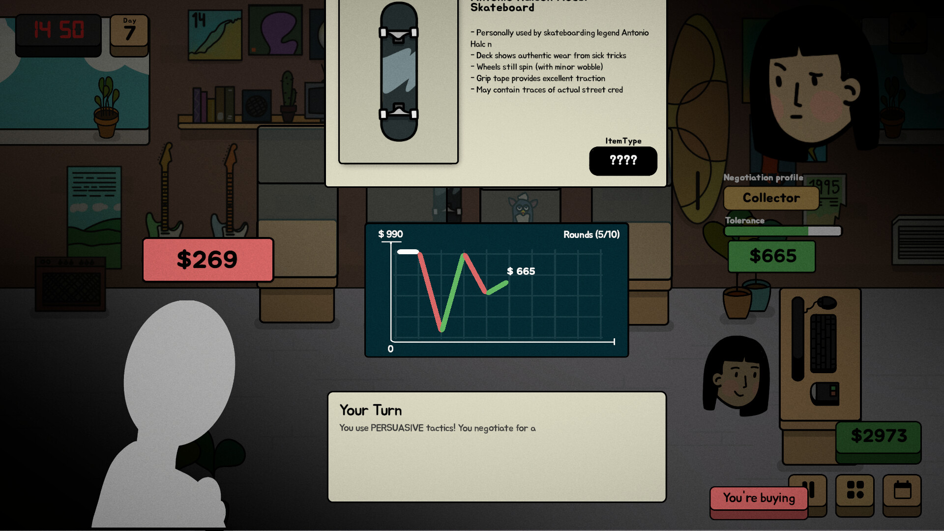 Build your Items Index, every successful haggle adds unique treasures to your collection. But rent hits daily: balance cash for bills against inventory investment. Overextend and face insolvency; play safe and miss opportunities.