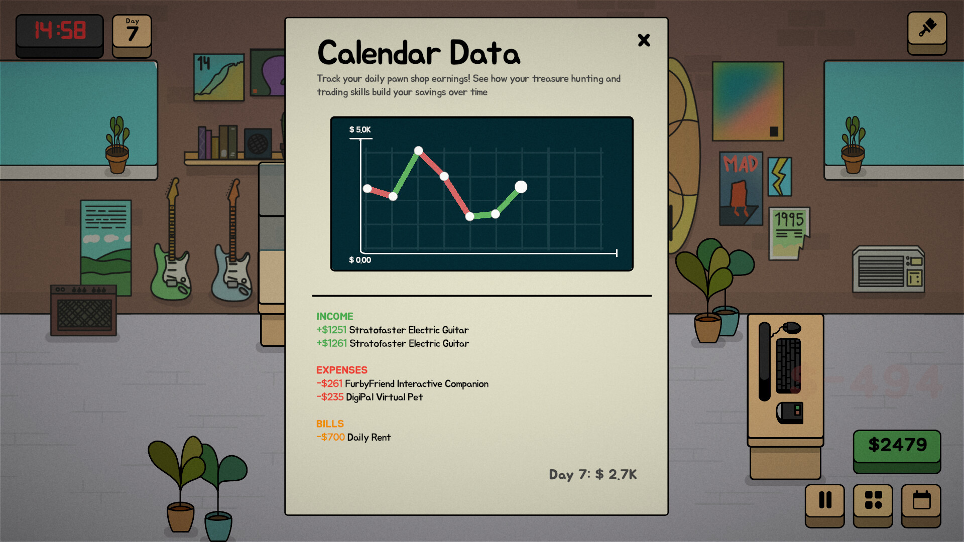 Build your Items Index, every successful haggle adds unique treasures to your collection. But rent hits daily: balance cash for bills against inventory investment. Overextend and face insolvency; play safe and miss opportunities.