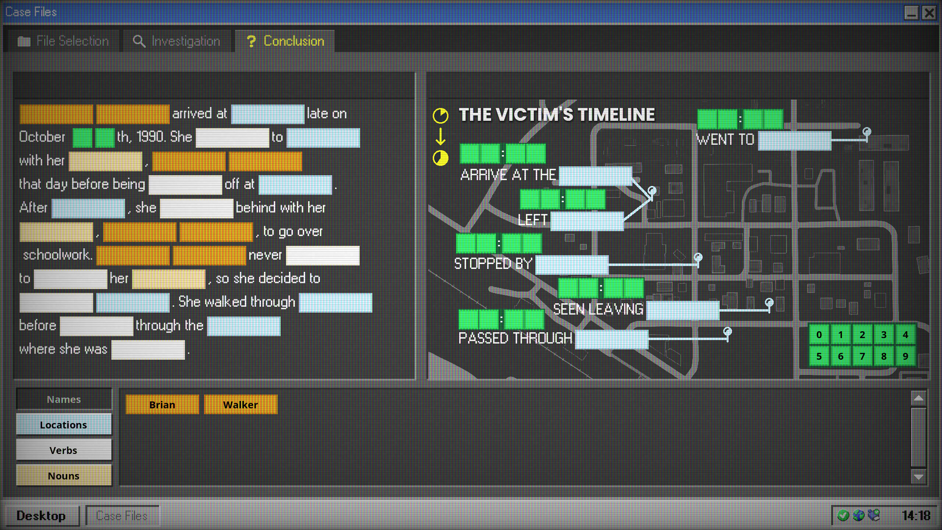 Each case file will require you to make a conclusion of what happened, how it happened, and who was involved. Use the information and keywords you've gathered to complete each statement to unlock new case files.