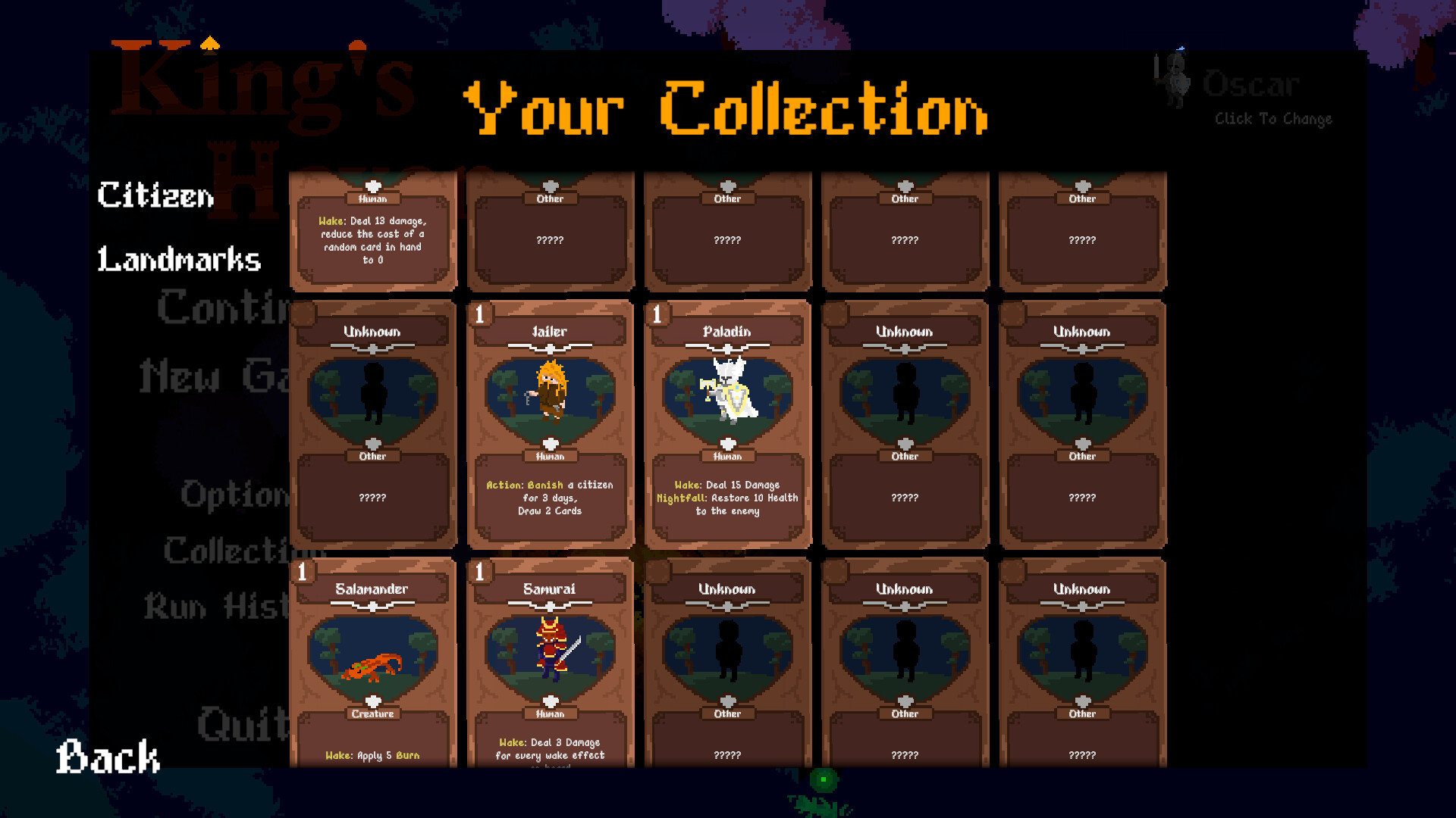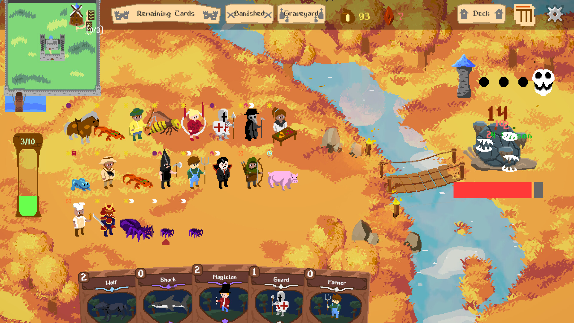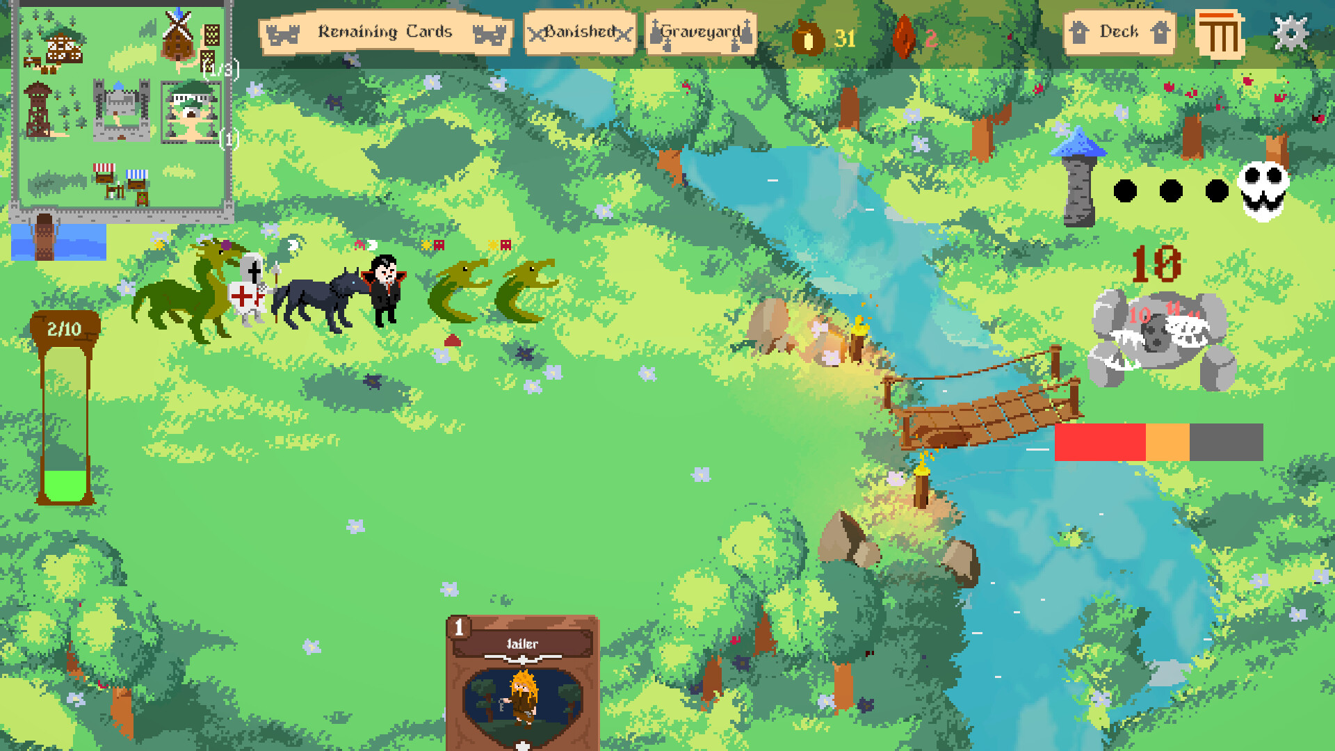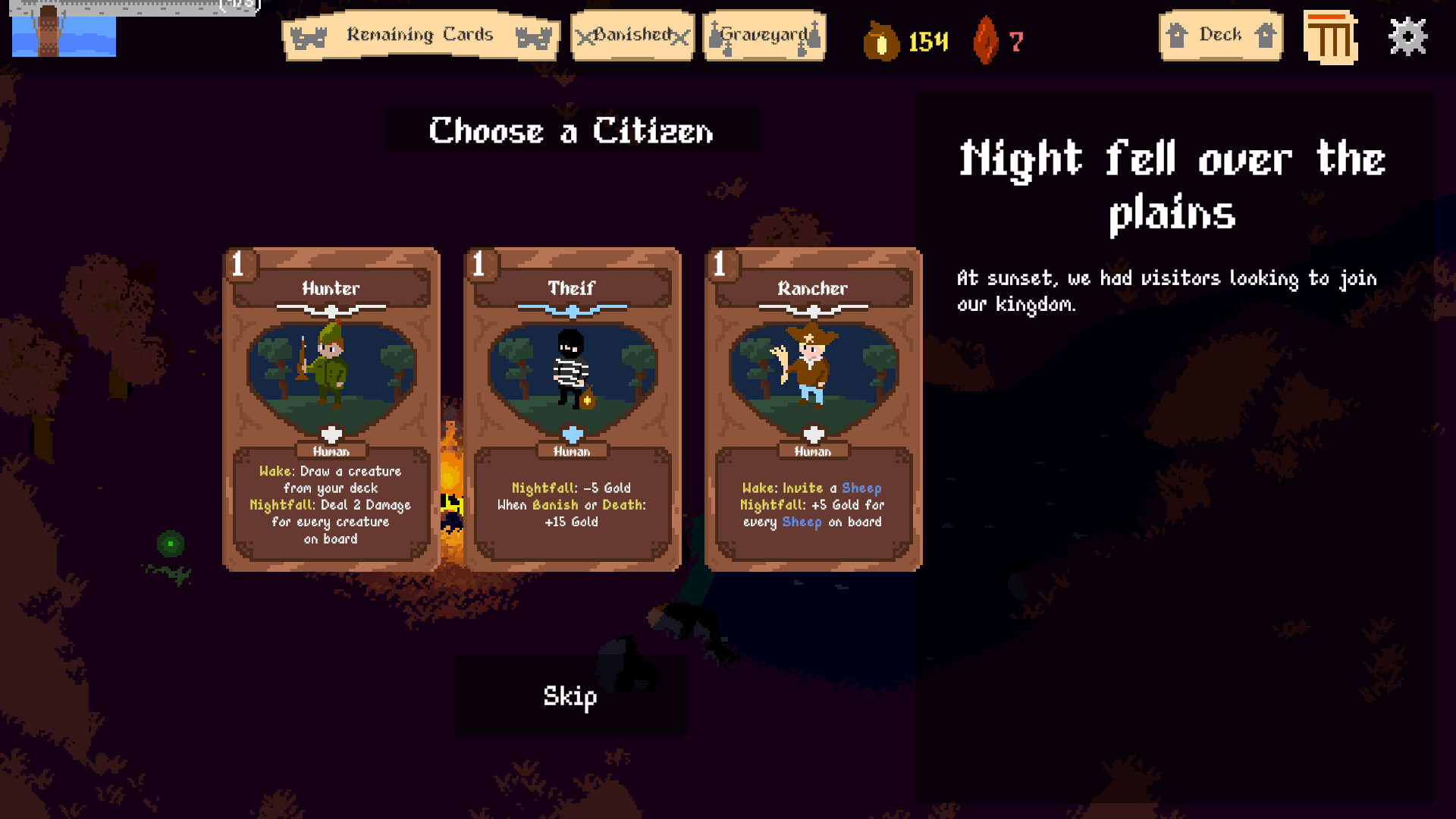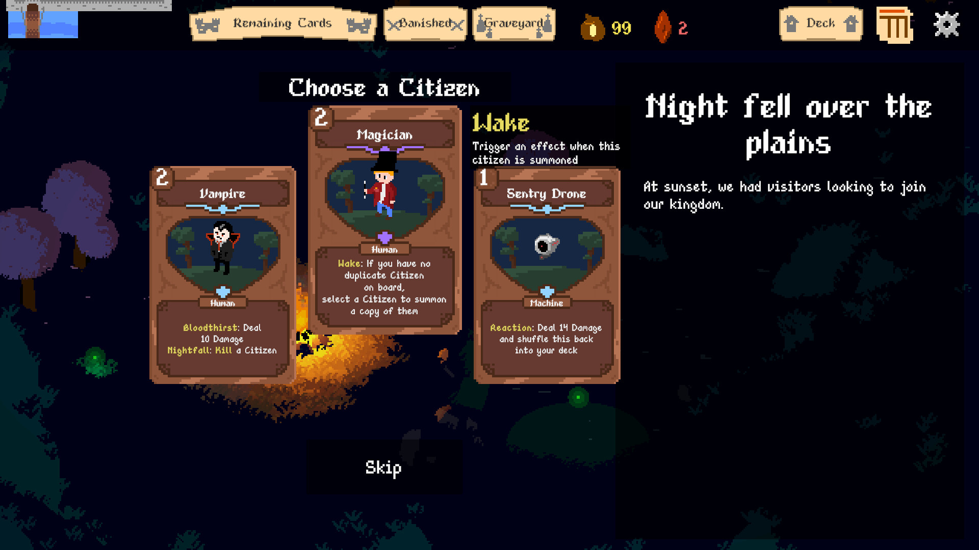 Build your deck of Citizen cards to defend your kingdom from various monsters. Each Card acts as a unit on board, and a CItizen in your kingdom. During the day you will play your cards to defeat whatever grizzly monster is at the gates of your kingdom. You will also make choices in dynamic story events, that will shape the future of your kingdom.