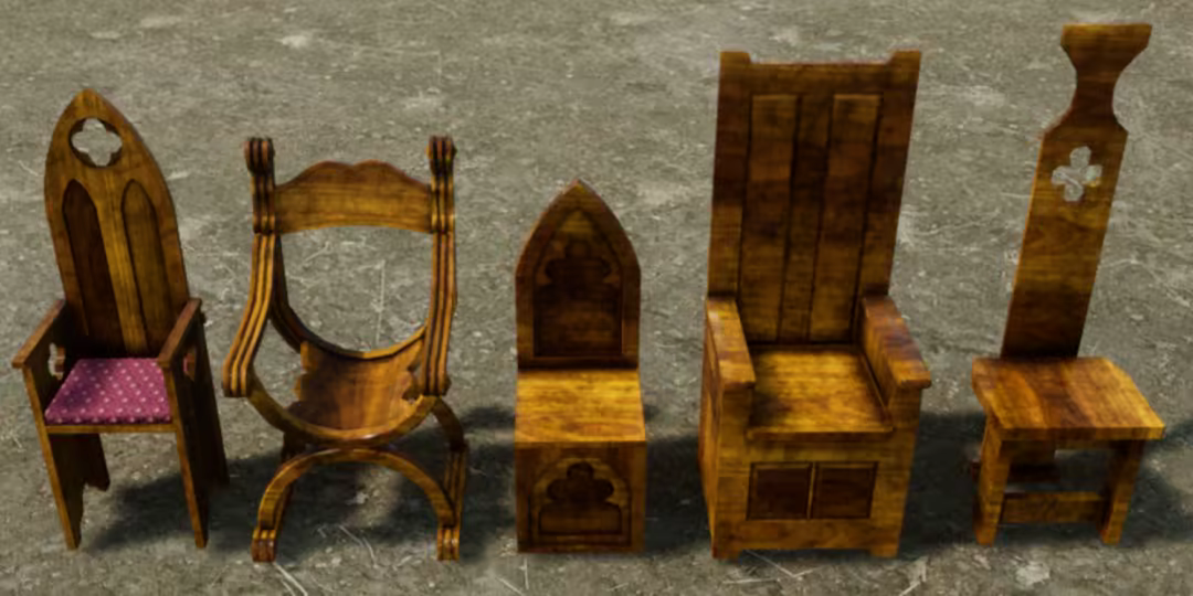 ·       A distinguished collection of 5 Gothic-style chairs, ranging from humble seating to grand, regal thrones: