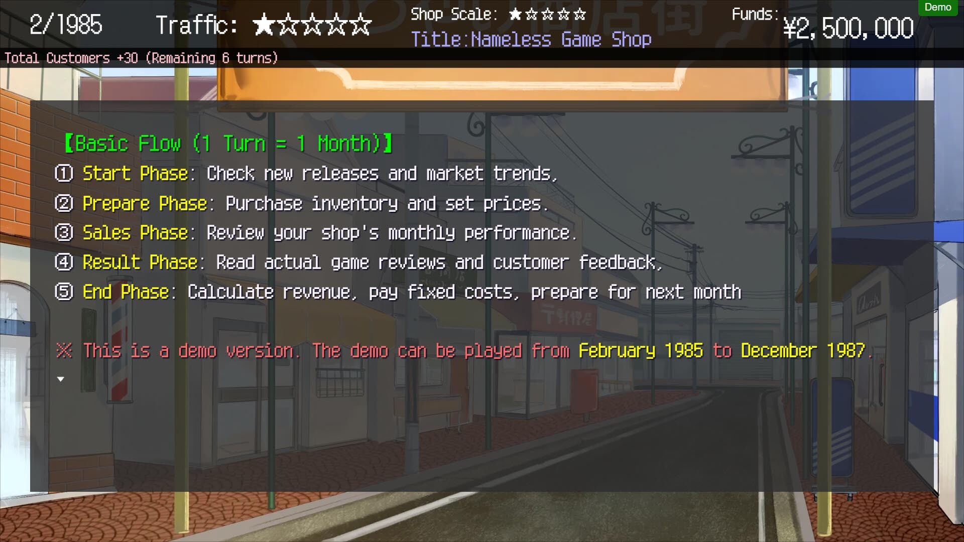 Manage your dream game shop through gaming history, starting from 1985. This demo covers the first three years of the iconic Famicom boom. Can you survive the dawn of Japan's biggest gaming shifts in this management simulation?