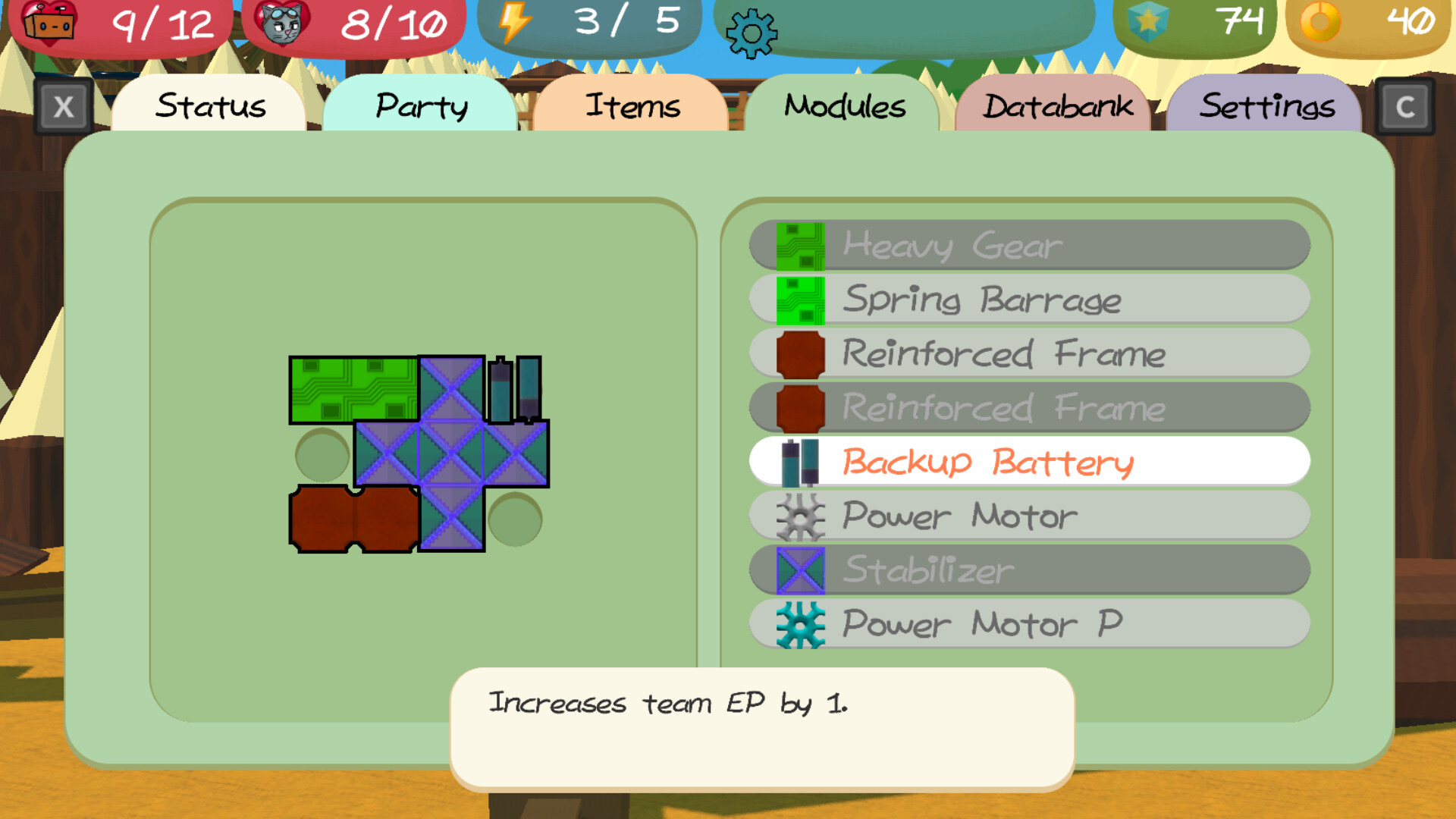 • Equip various modules to improve your stats, arranging them to fit in to your ever-growing grid of module slots!