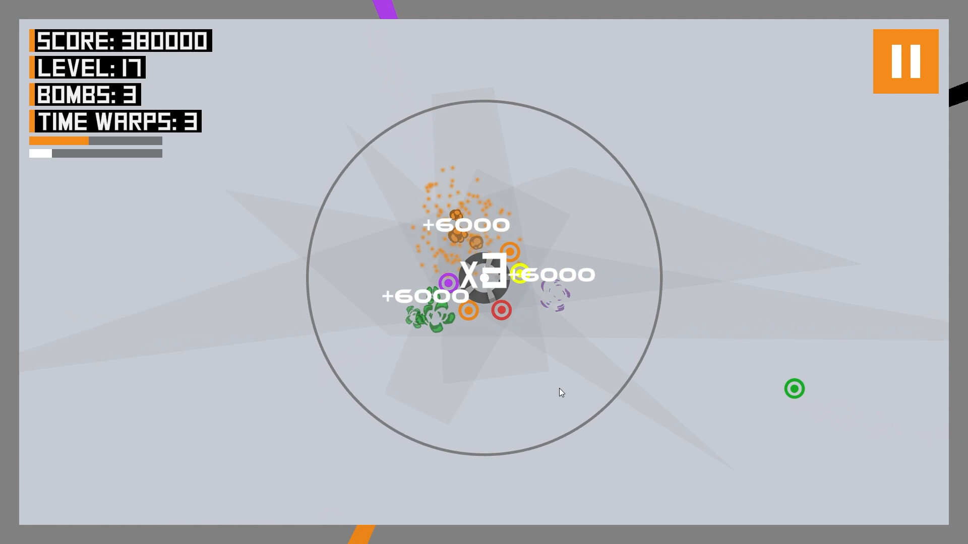 If you rarely mismatch the colors of the particles, a bonus mode will be triggered. White particles will begin to appear and these can destroy any particles they touch. White particles give bonus points when destroying other particles.