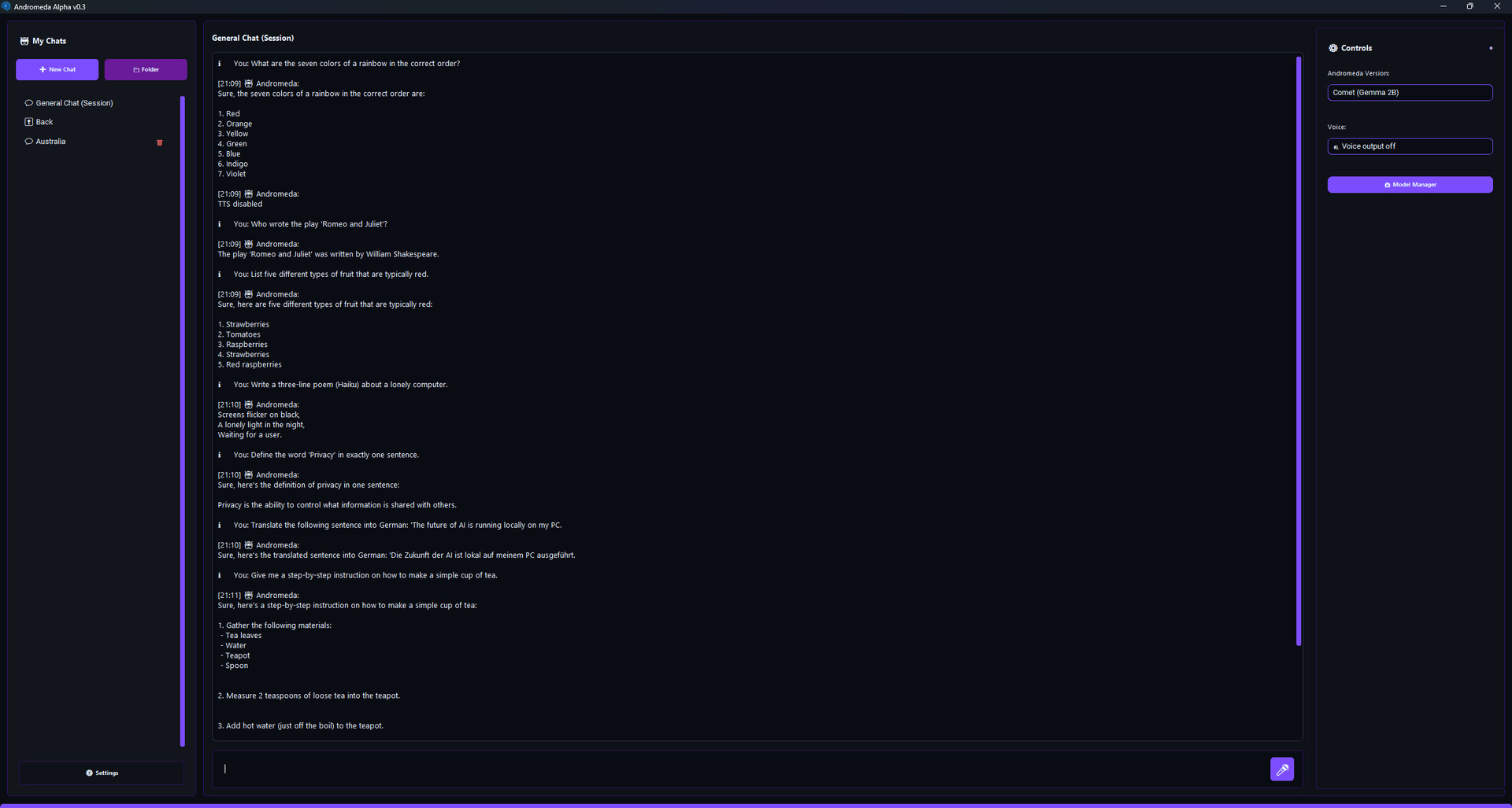 «SmarterWaysProductions: Andromeda está en Early Access porque el software todavía se encuentra en desarrollo activo y se está ampliando gradualmente. El enfoque actual está en una funcionalidad IA básica estable que funciona localmente.