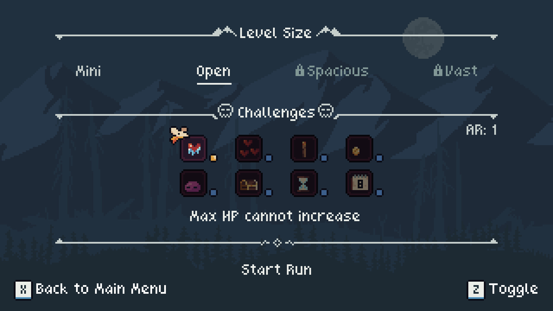 • Challenge modifiers for adjusting game difficulty and level size. Demo has 1 modifier: lock max HP