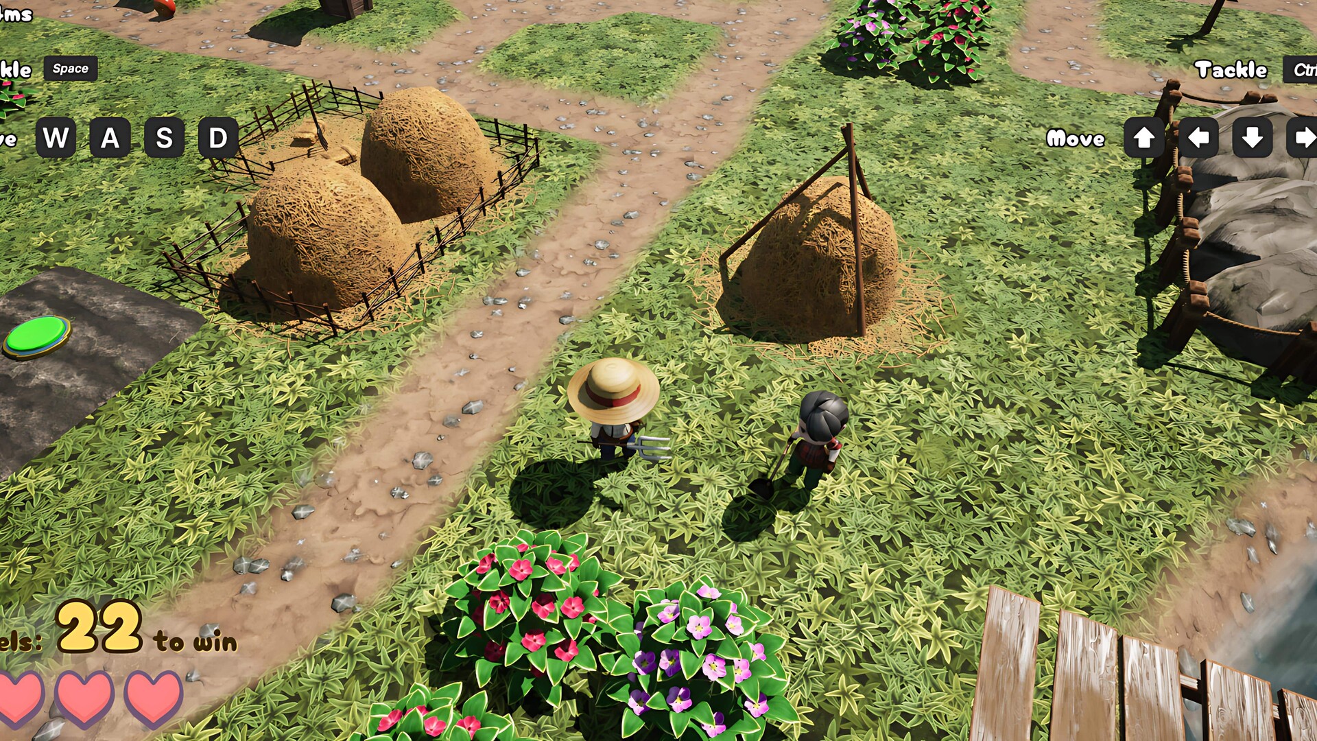 This is a fast-paced asymmetrical multiplayer game where one player controls two determined farmers, and everyone else plays as mischievous slimes trying to steal every apple on the farm.