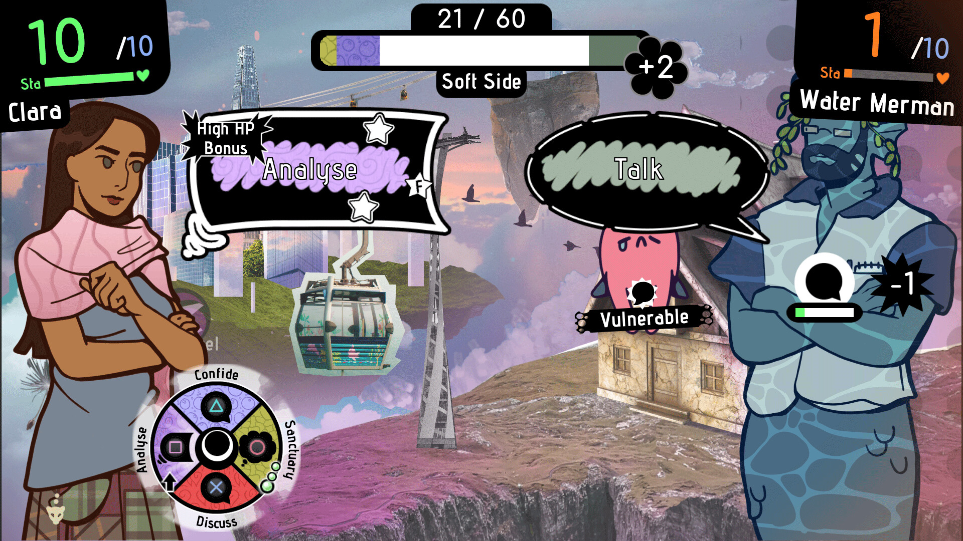 Inspired by classic and modern JRPGs, active conversation encounters have you strategically Talk, Listen and Think using a variety of elements to reach an understanding with your partner before you run out of stamina. But it takes two to have a conversation, and reaching an understanding doesn't mean defeating your partner! They have their own abilities, patterns and stamina you'll need to consider and coordinate with, in order to succeed as a team.