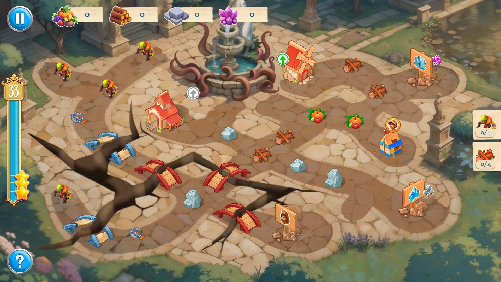 Lost Artifacts is a classic time-management game with worker assignment: on each level you quickly gather resources (food, wood, etc.), build and upgrade structures (farm, sawmill, workers’ house), clear obstacles, and manage to complete the objectives for ‘3 stars’ before the timer runs out, using temporary boosts (speed-up, time stop, construction speed-up).
