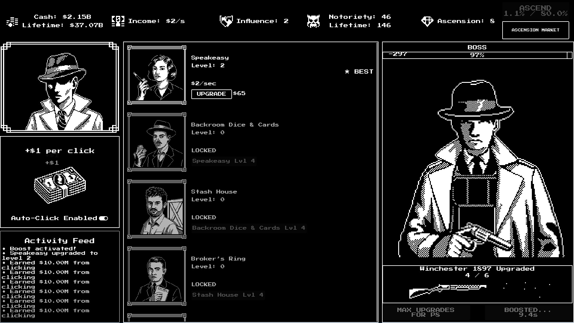 Invest in over 20 different illegal operations across the city. Run speakeasies where the booze flows freely, operate gambling halls where fortunes change hands nightly, and control protection rackets that keep businesses "safe." Each operation comes with its own unique owner who has stories to tell and wisdom to share.