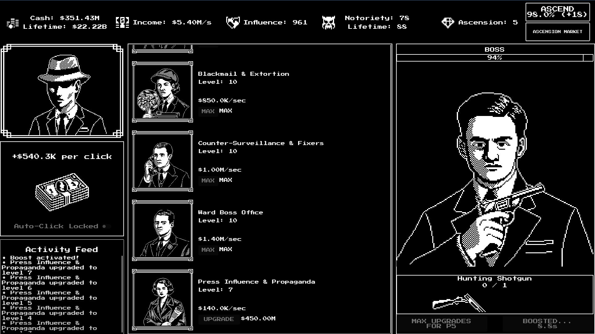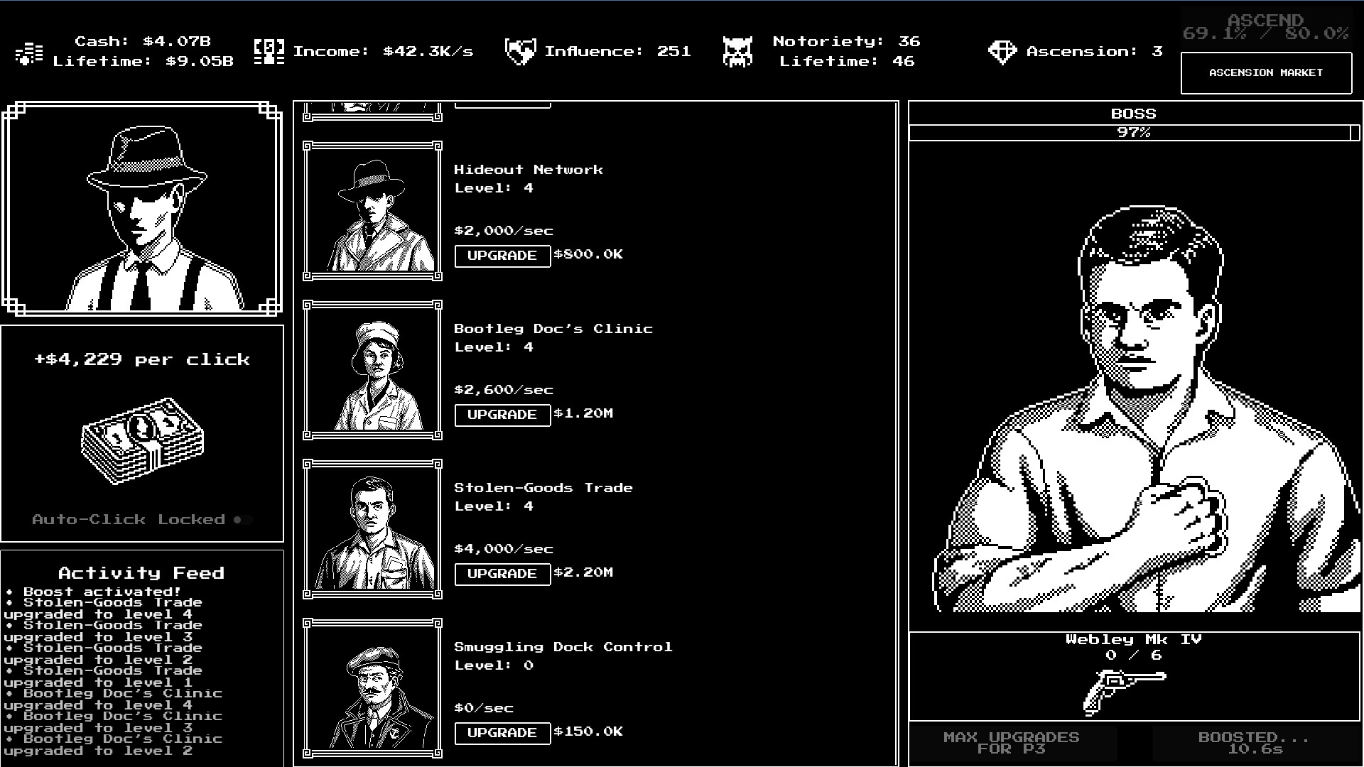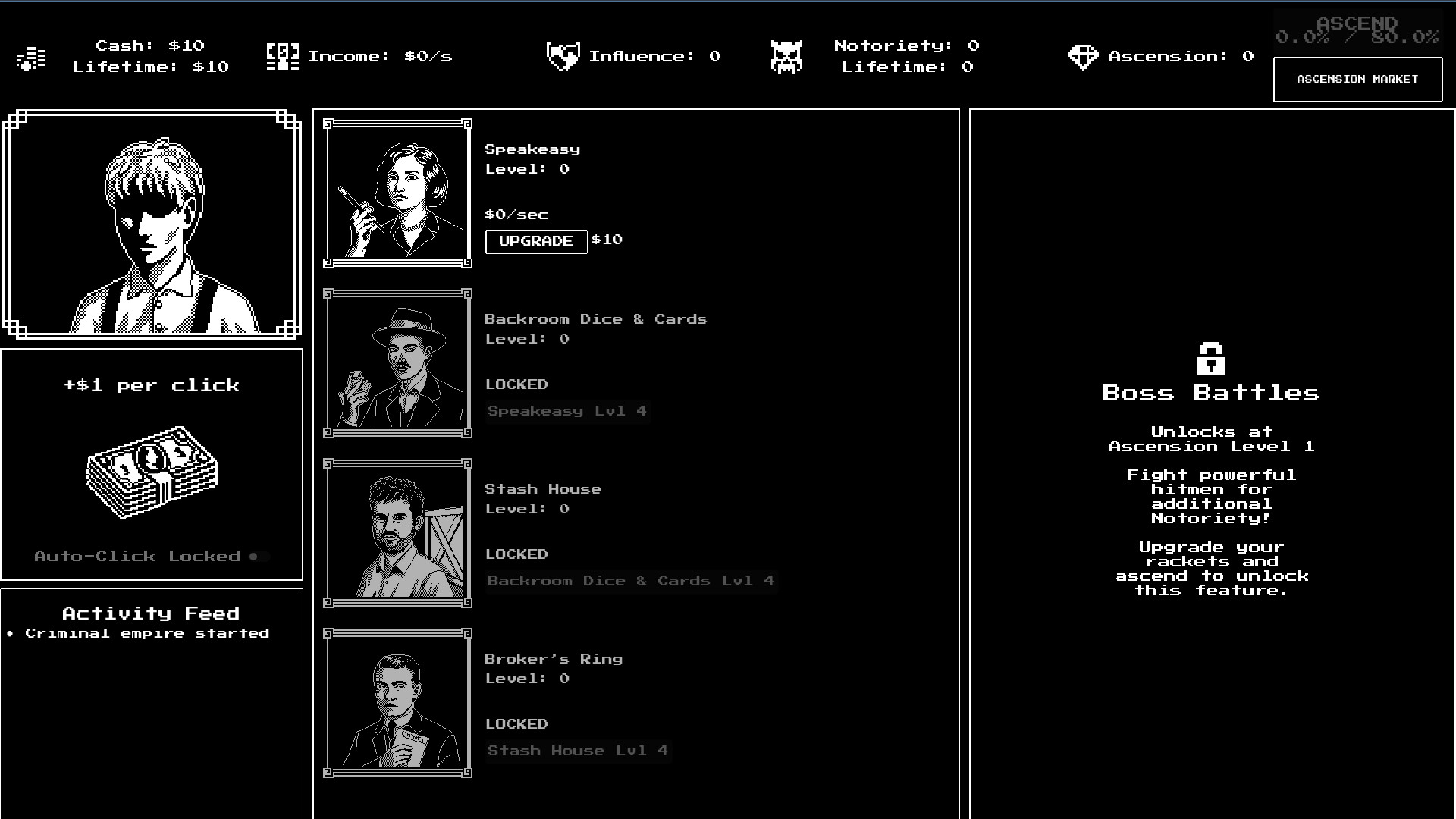 When you've built your empire as far as it can go, it's time to start over - but not empty-handed. The Underground Market offers powerful permanent upgrades that make each new attempt stronger than the last. Climb the hierarchy from street thug to underboss to the ultimate crime lord.