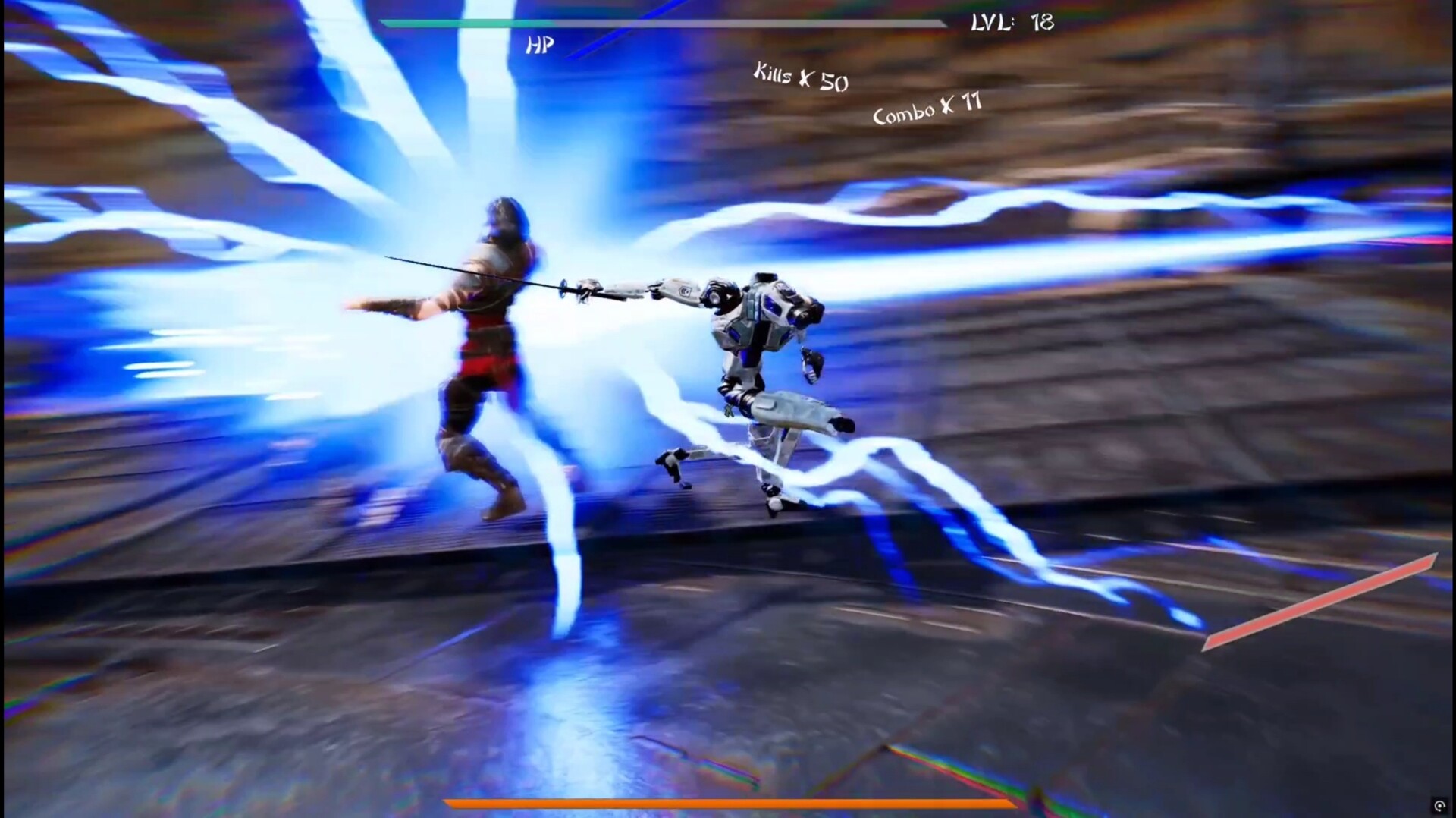 Sci-fi first person hack n' slash where you can block while attacking and platforming around enemies. Move backwards while attacking to gain distance and thrust into enemies for less chance of getting hit once your parry stock is depleted.