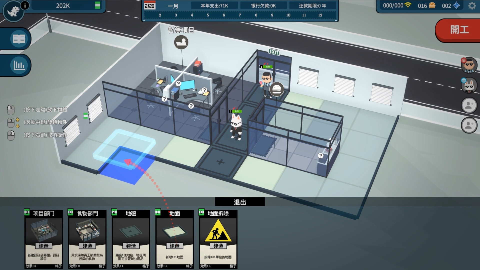 年初的準備階段,玩家可以使用建造卡擴建場地和建造設施,根據專案需求使用僱傭卡僱用員工。設施分為研發部門,食物部門,伺服器室和學習室。玩家需要分配人才資源到各部門,以維持公司運作。玩家可以為老闆和管理階層員工配置技能卡,卡牌持有者不能持有超過本人最大行動點數的卡牌。卡牌分為建造卡,僱傭卡,陷阱卡,技能卡。