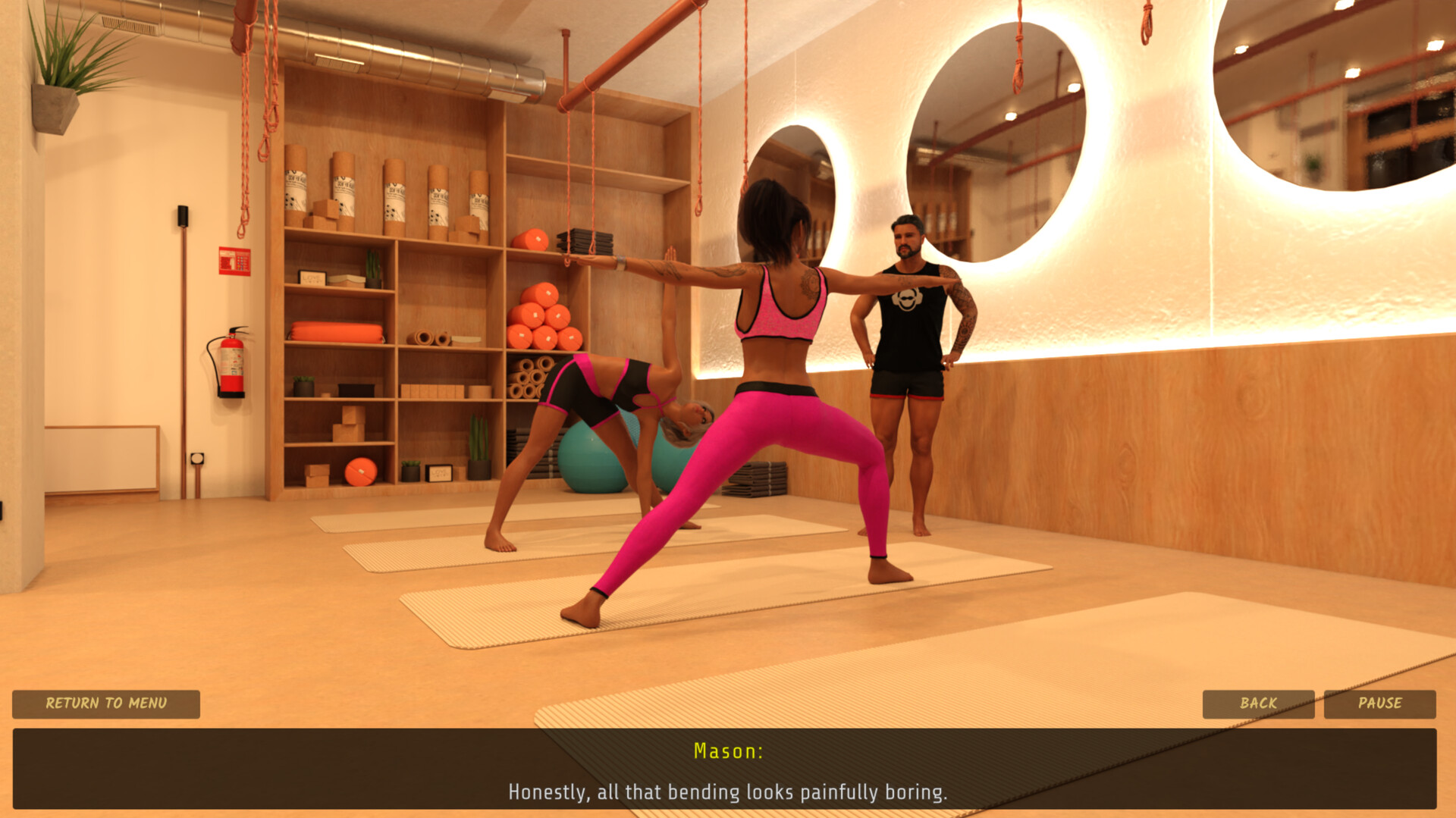Enjoy an erotic visual novel featuring a guys and his 2 hot girl friends, and an engaging sex simulator. A yoga class is a good idea to relax and unwind after a long day. But, after a few sexy yoga poses, things turn into some hot sex.
