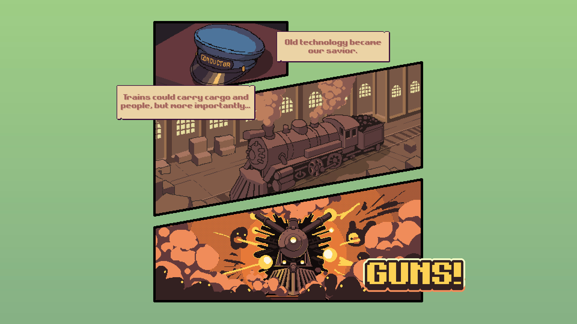 Every wave and every run gives you new choices of wagons and upgrades, unlocked through a growing deck of cards. Will you add heavy cannons, support cars, or storage to push for bigger profits? Adapt your train to the threats ahead and keep moving!