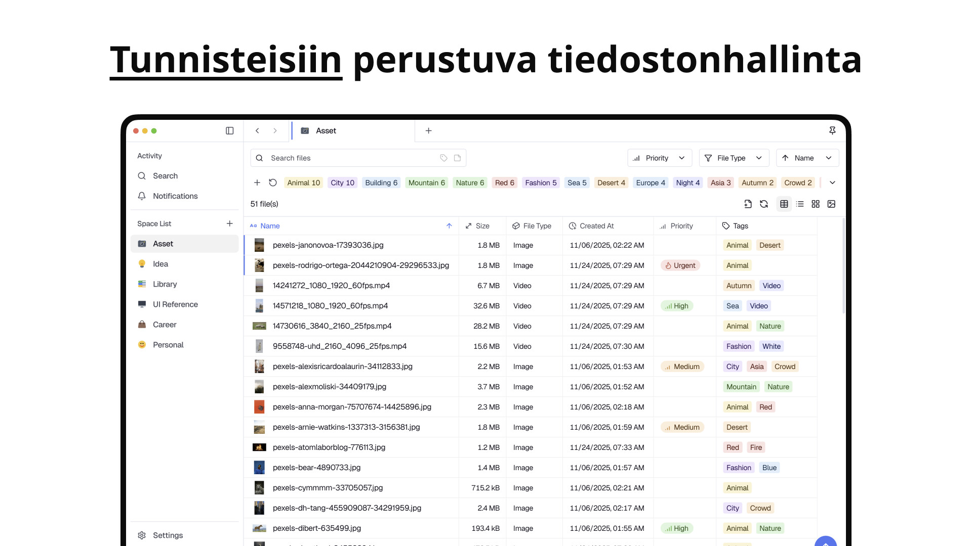 • Tunnisteet: Liitä tunnisteita tiedostoihin organisoidaksesi niitä joustavasti.