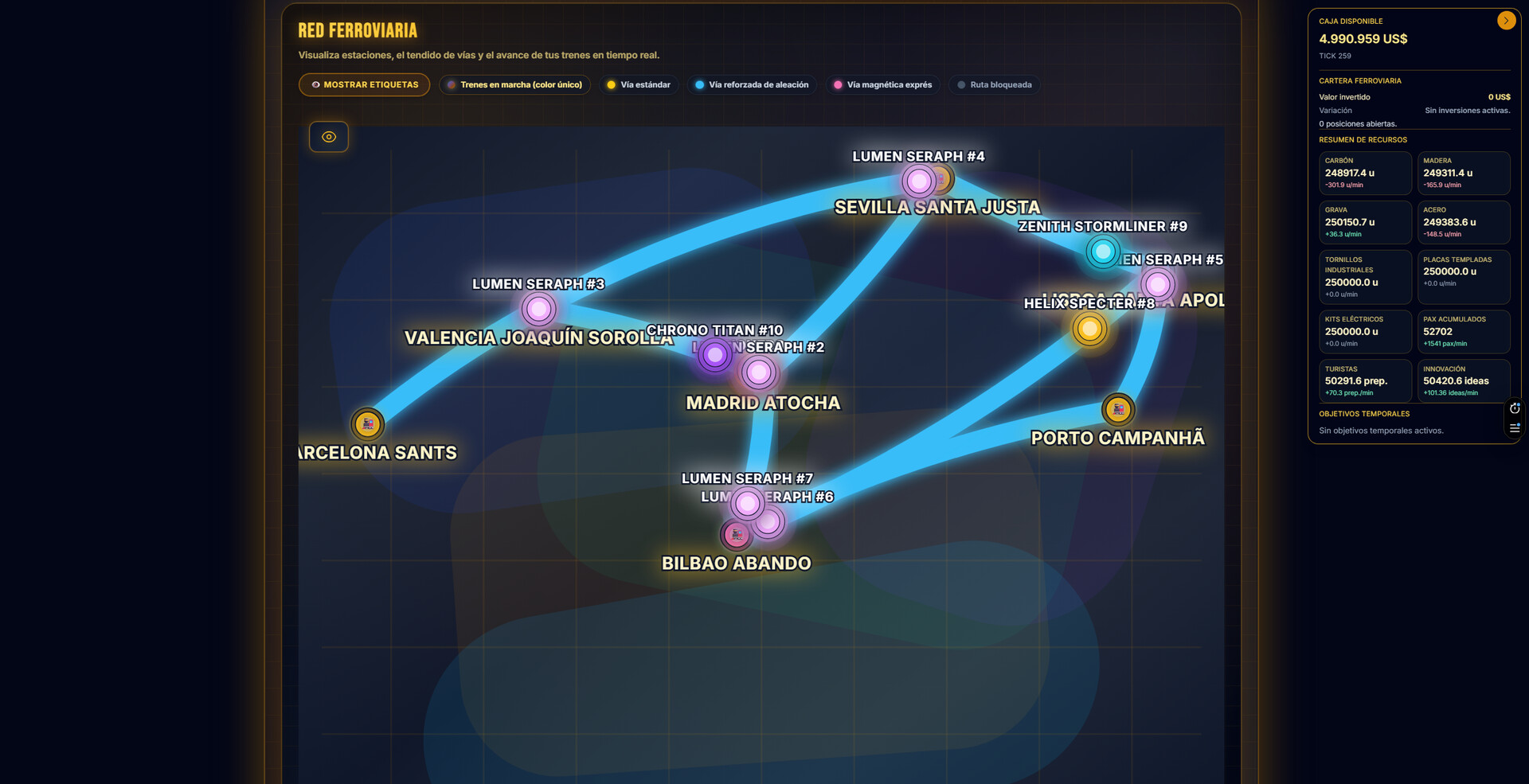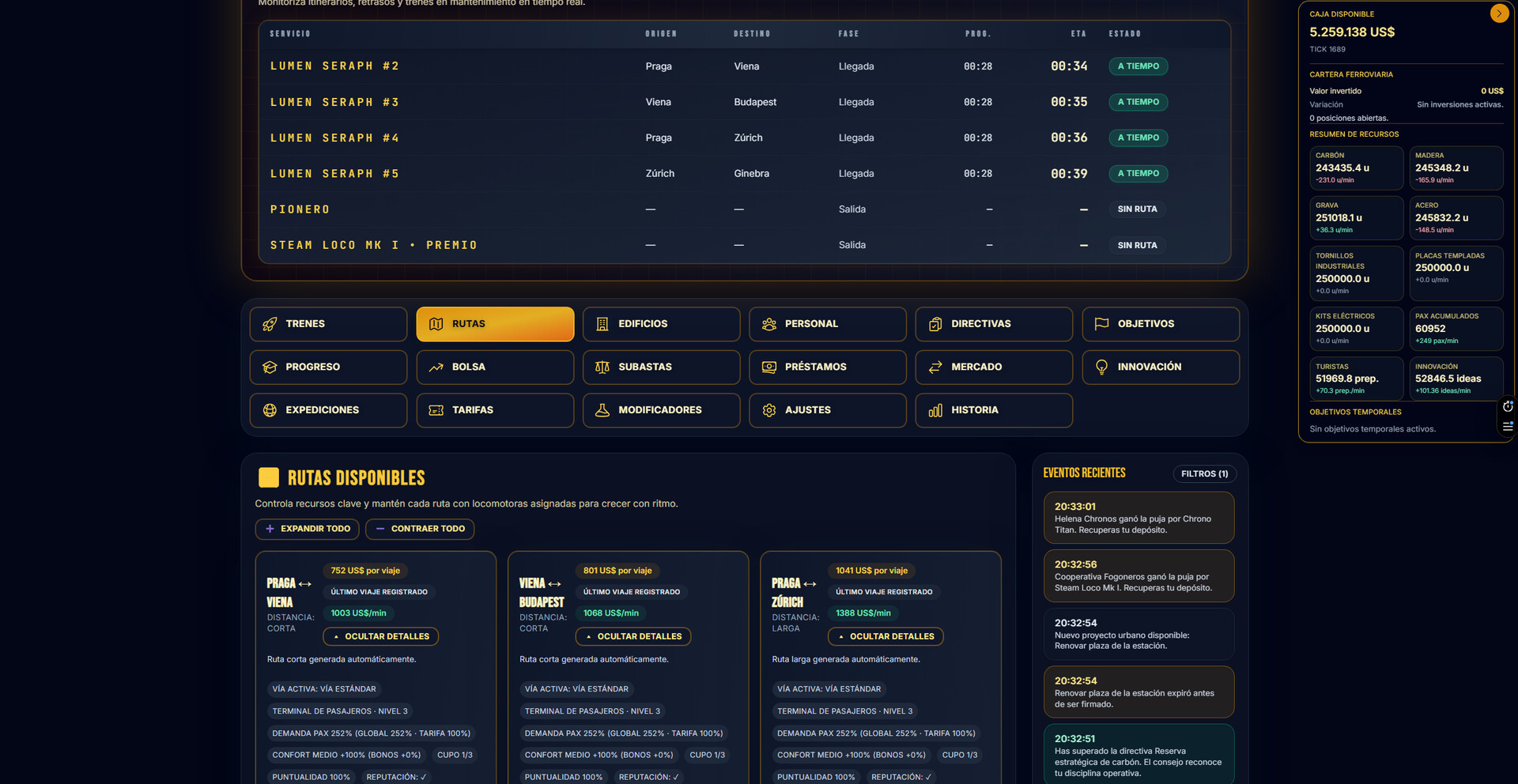 Steam & Steel — Railway Tycoon puts you in charge of a dieselpunk railway empire running in fast-paced idle/active sessions, straight from your browser—no installs, no loading screens. Coordinate a one-second-per-tick gameplay cycle, speed things up at x2 or x4 when urgency calls, and pause at will to plan every decision in peace. Masterfully manage cashflow, coal, timber, steel, passengers, and reputation while juggling the ever-growing demands of your network.