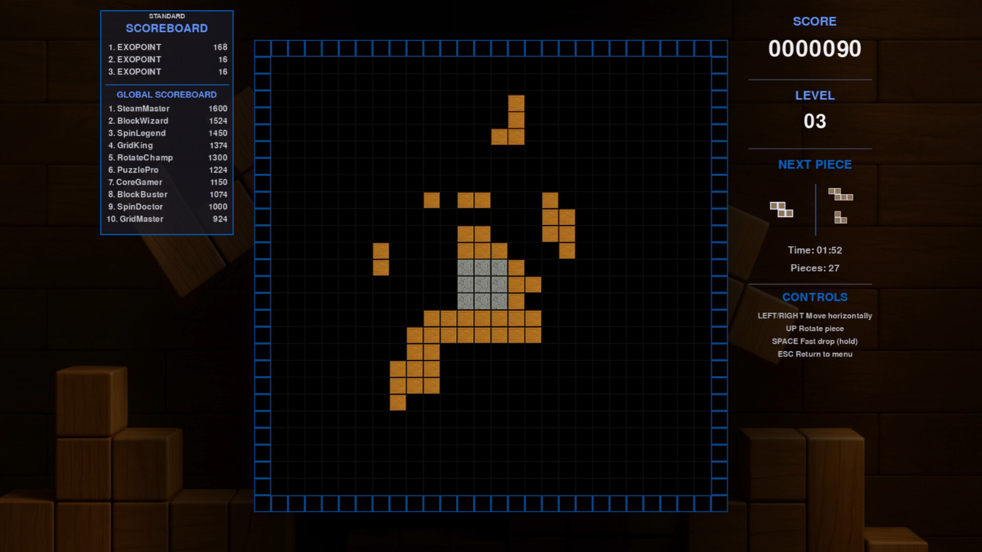 SpinGrid challenges your reflexes and strategy in a rotating arena where the rules are simple but the gameplay is endlessly engaging. Instead of clearing lines, you’ll need to create solid 3x3 block formations — all while the playfield spins and an indestructible core stone sits at the center of every match.