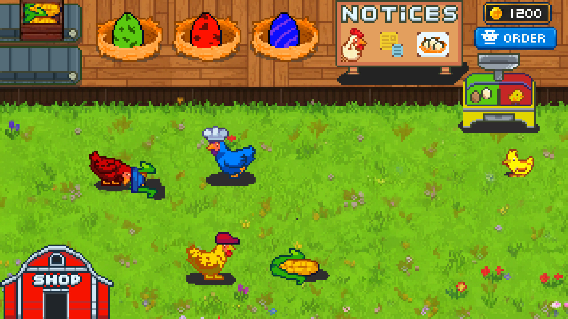 A charming pixel art chicken management game where your goal is to build the ultimate colorful chicken farm!