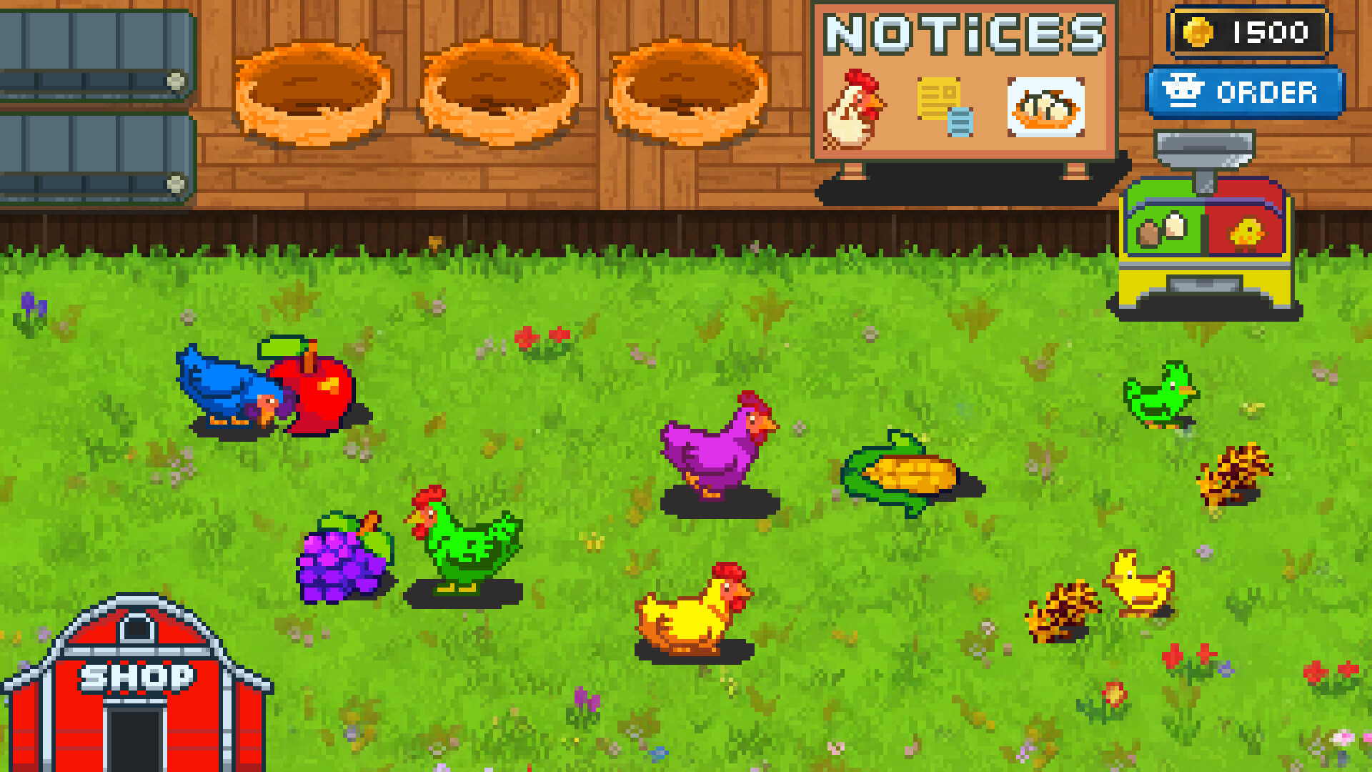 Een charmant pixel art kippenbeheer-spel waarin je doel is om de ultieme kleurrijke kippenboerderij te bouwen!