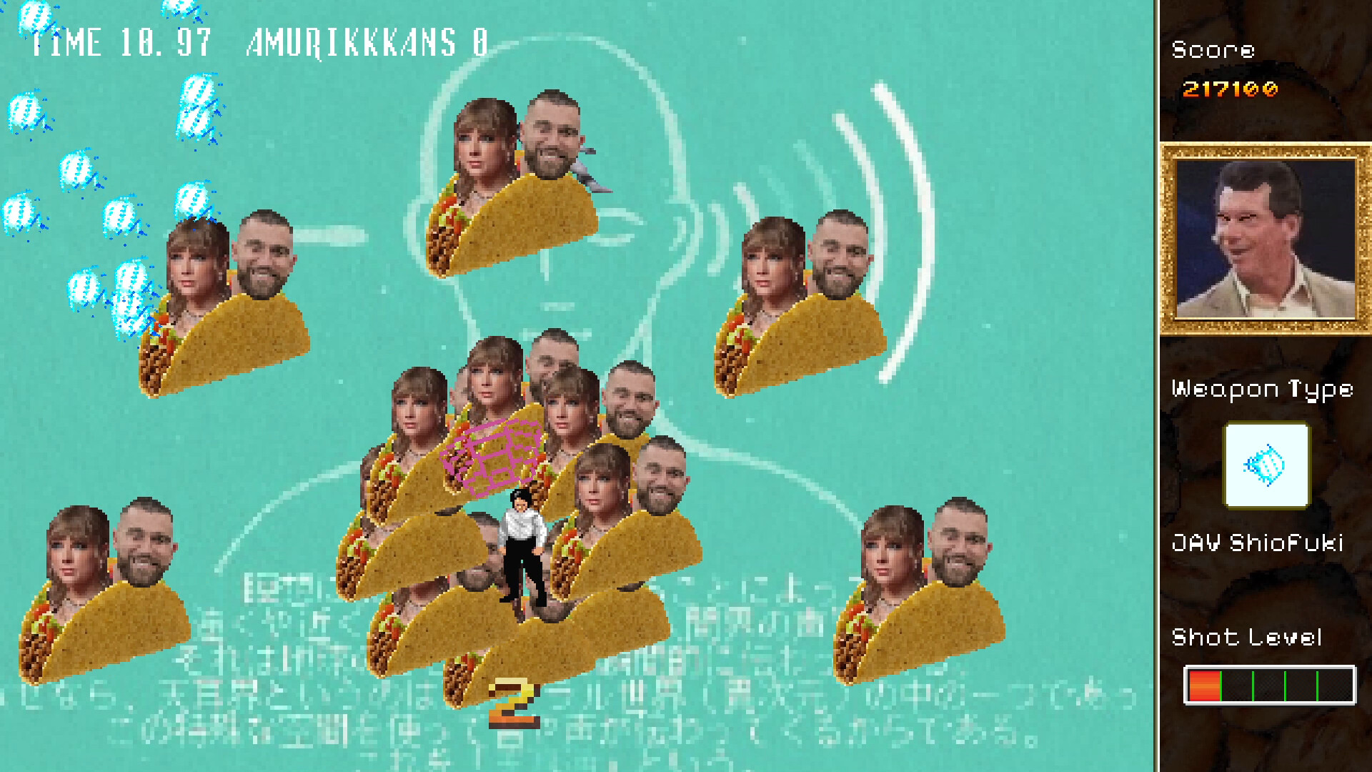 While Hong Kong 2097 is a much more fleshed out game than the original, you can still expect the tasteless story, haphazard character design, head-scratchingly random environments and 7 second music loops that made Hong Kong 97 so "great". One minute you'll be shooting down dancing hot dogs on a ranch in Texass, and the next you'll be fighting off flasher Uncle Sams in Idahoe.