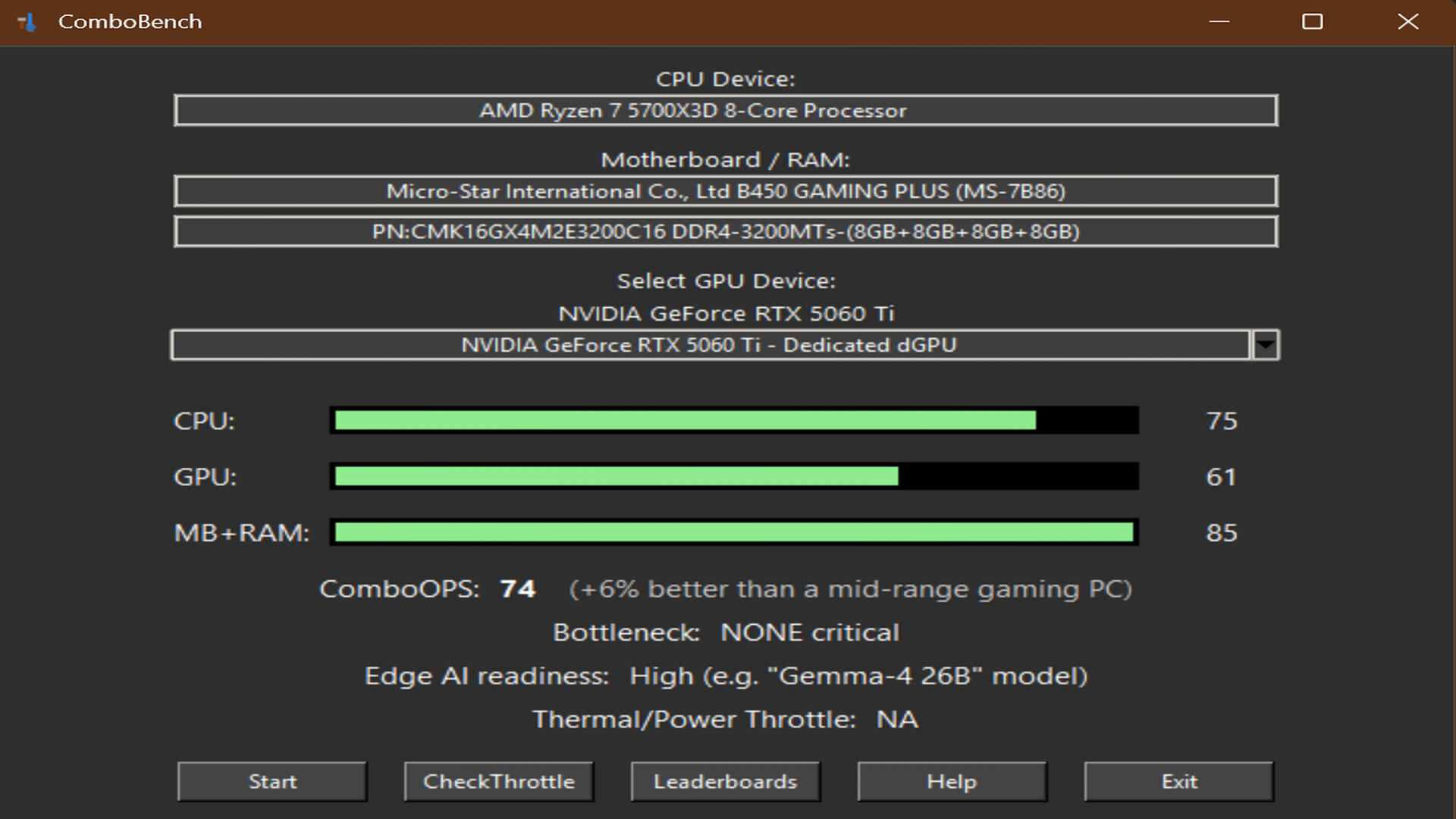 System benchmark that test CPU/GPU/RAM-BUS all together and detects the bottleneck device in your PC in terms of gaming/AI heavy loads equivalent scenarios. Main components(CPU, GPU, RAM together with motherboard BUS) are ranked in corespondence to each other so the weakest components in the PC can be indentified.