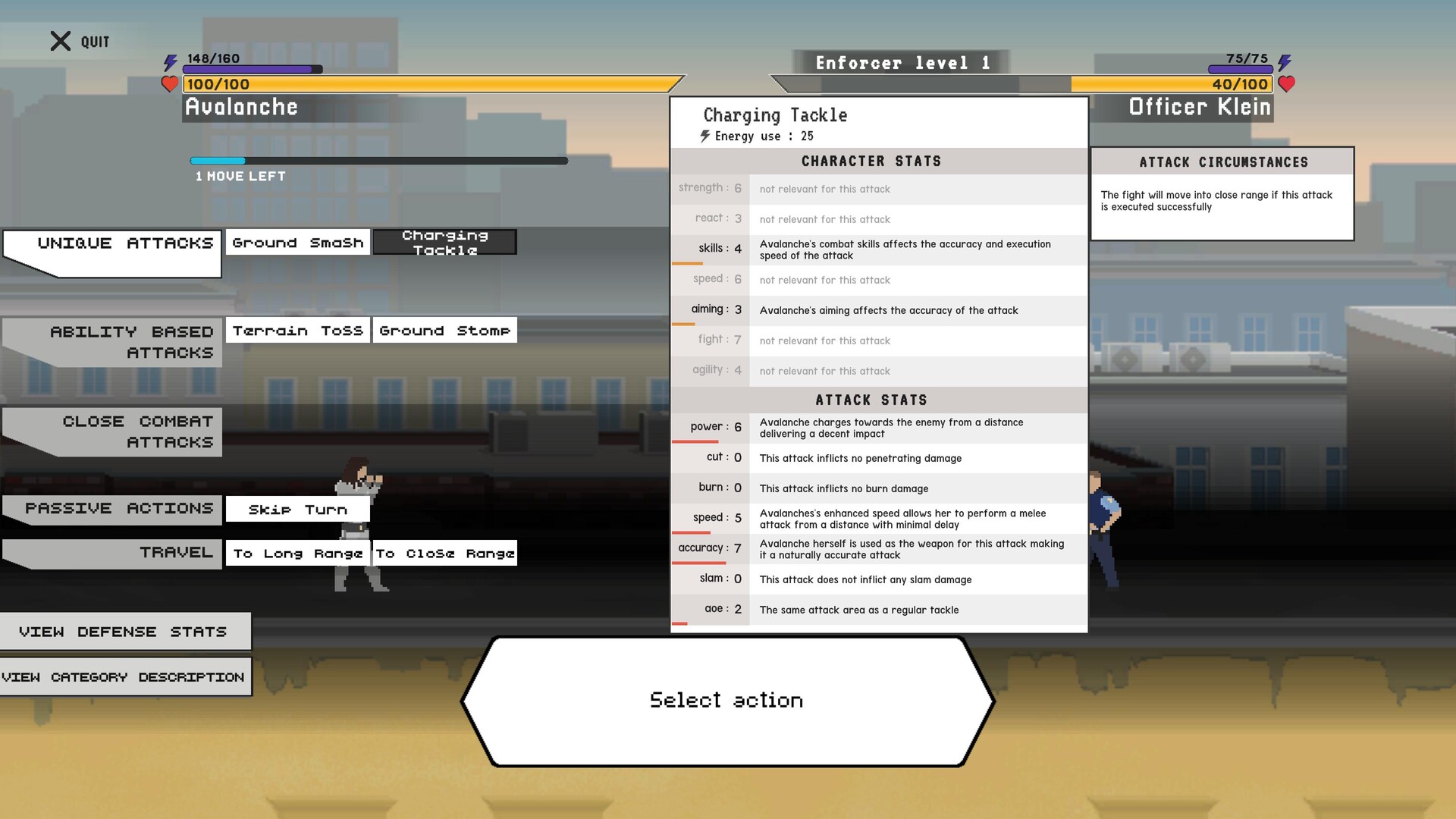 Powers Downtown is a turn-based combat RPG that features a unique fighting system. Your objective is to roam the rooftops of the city, battle enemies of varying abilities and gain experience when defeating enemies. Search for strong fighters to recruit and build a formidable team.