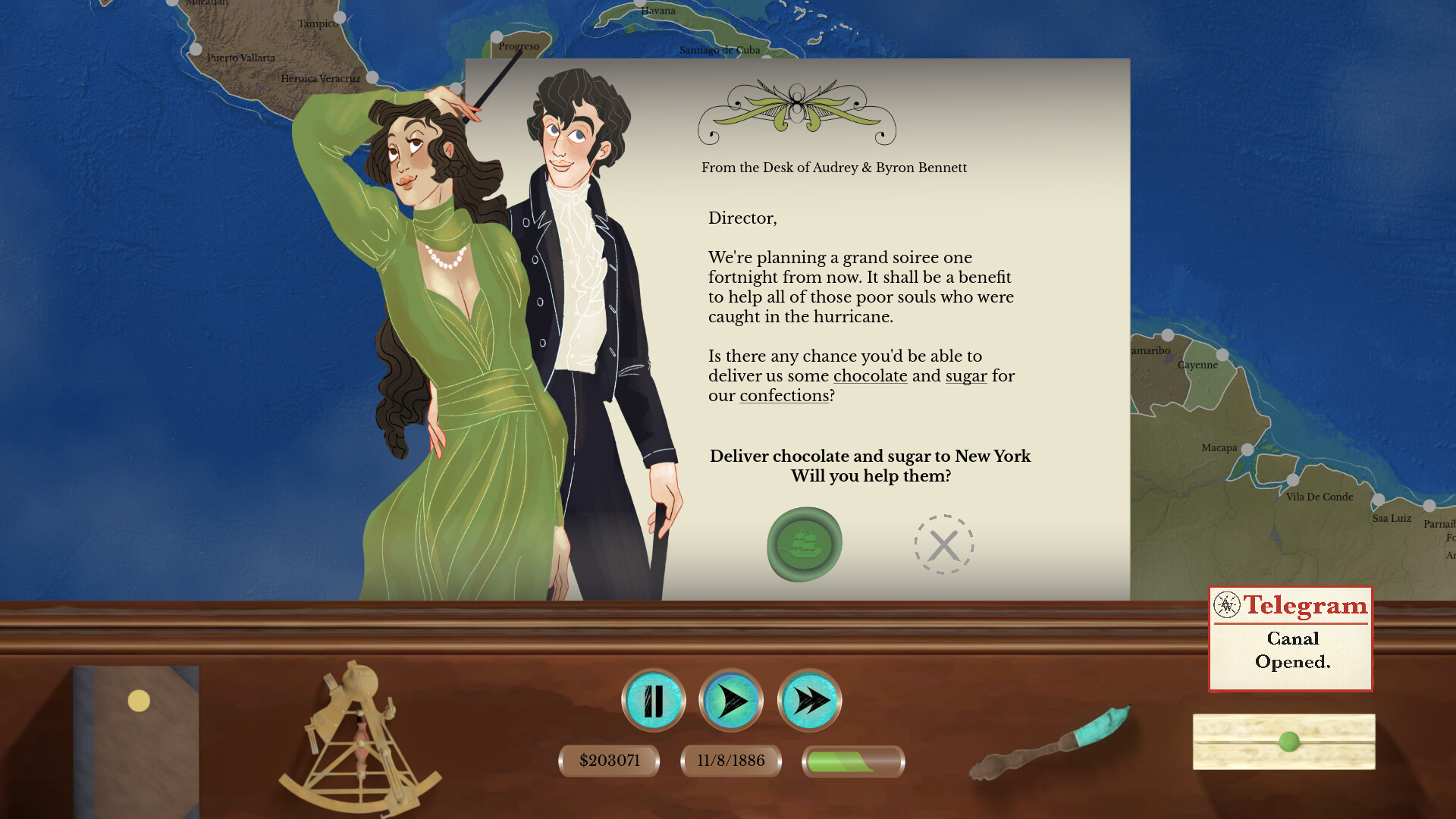A turn-of-the-century transportation management game in which you control the world's largest cargo shipping company. Connect ports, deliver cargo, cultivate relationships, and adapt your business all while trying to avoid getting fired.