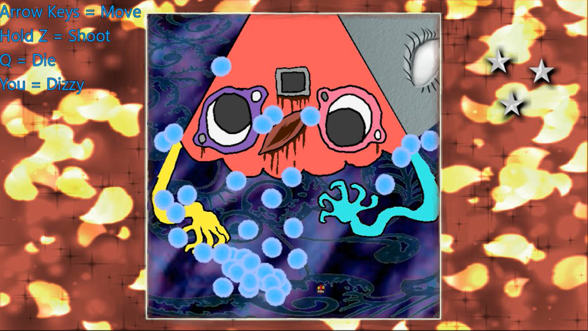 A surreal bullet hell shmup about a face fighting a wheel! Dodge bullets and shoot down an onslaught of 6 difficult hand-animated bosses with carefully curated bullet patterns. battle to hectic music and aim to get hit as little as you can manage in...DIZZYS!!!