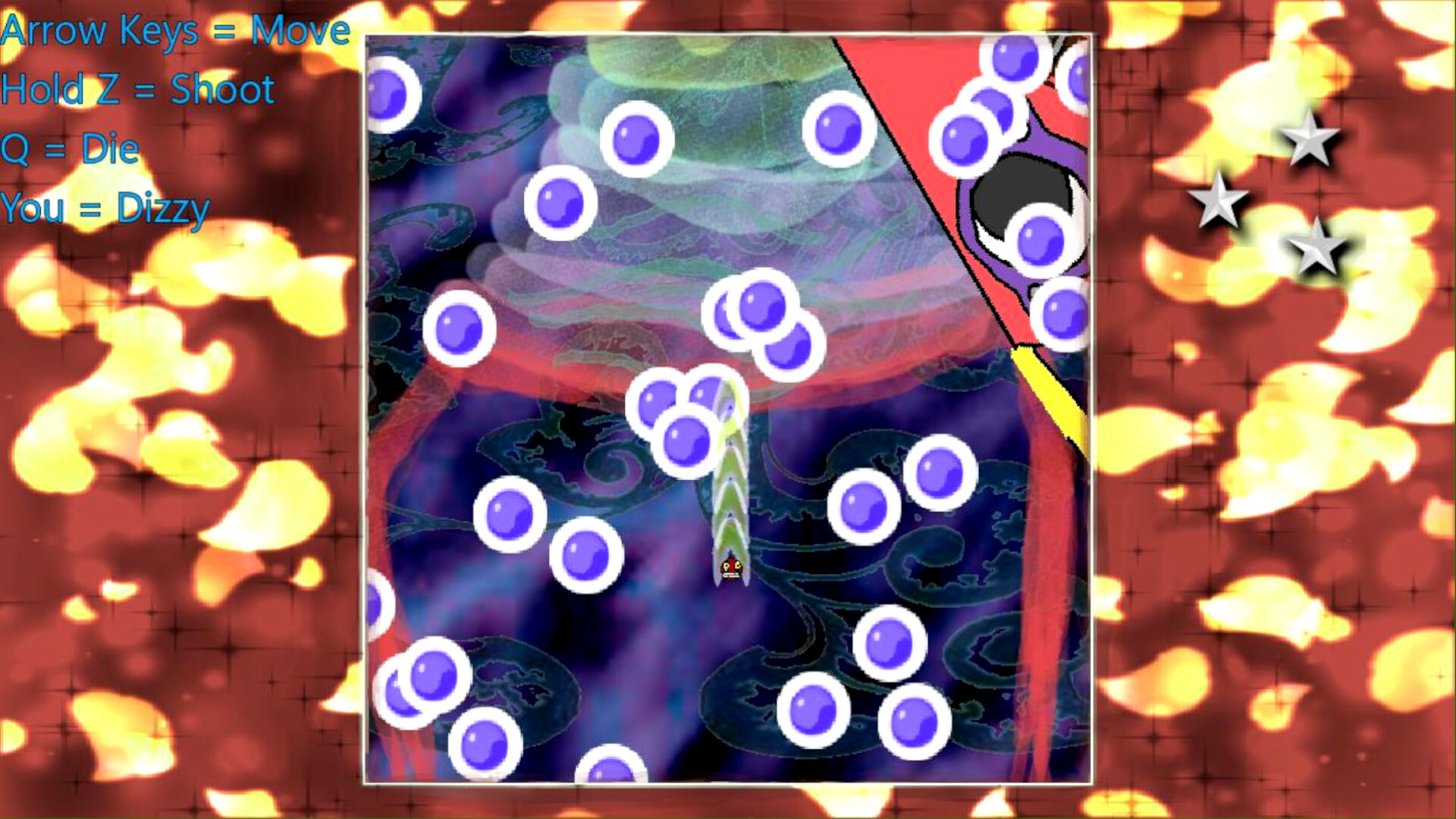 The game itself is as simple as can be: when you start the game and get through the monologue at the beginning, you are presented with a player character that you move around with the arrow keys inside of an area defined by a border, and a giant wheel at the top. this wheel has wedges that each act as their own multi-phase boss. each phase activates bullets spawners, which volley bullets across the screen for you to dodge, and you progress though the game by holding the shoot button [Z] to fire your own bullets at the wedge. if your lives represented by the stars in the top right deplete, its game over. but don't worry! every time you defeat a wedge, you gain a life! The game has some sharp difficulty spikes throughout, you move pretty fast, and there are some surprises all throughout, making for an all-around hectic experience that will leave you pining for the win! you also get a reward if you win, based on your performance. They're nothing special, but make sure to screenshot your reward if you got a good one, because the game doesn't save data across playthroughs.