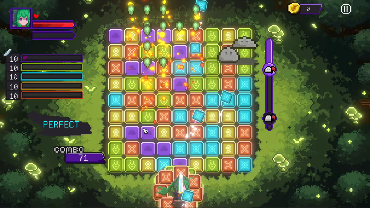 Each electronic track is a 2-minute battle. Eliminate Metal/Wood/Water/Fire/Earth tiles to fire barrages. Combos trigger hero skills (e.g. "Magnetic Brickstorm", "Holy Aura", "Cavalry Charge").