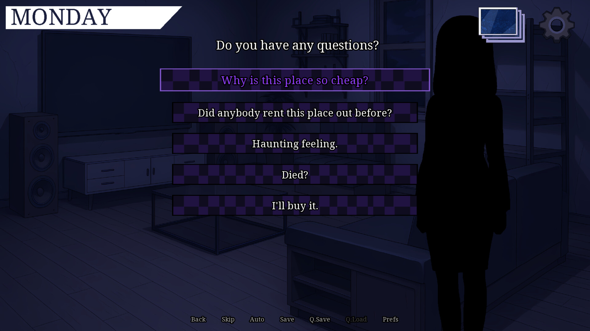 Each day, you must locate a randomly generated card hidden in one of the five map locations to progress in the game. In certain areas, a ghost ambush can occur once per day, temporarily seducing you. During this encounter, a timed quick-response choice will determine whether you give in... or resist her temptation.