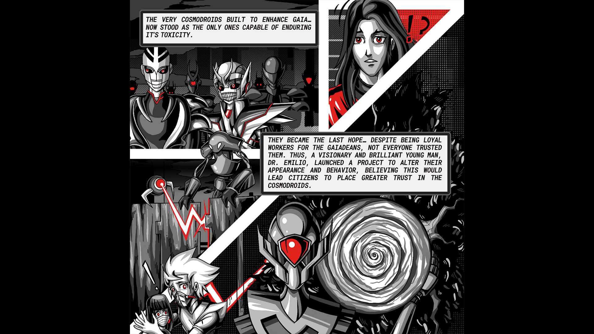 Discover the story leading up to Cosmo Knight Zion with this mini comic, where you can learn more about the Cosmodroid invaders, their origin, how they arrived on Earth, Cosmo Knight Zack's plans, and the future of the planet.