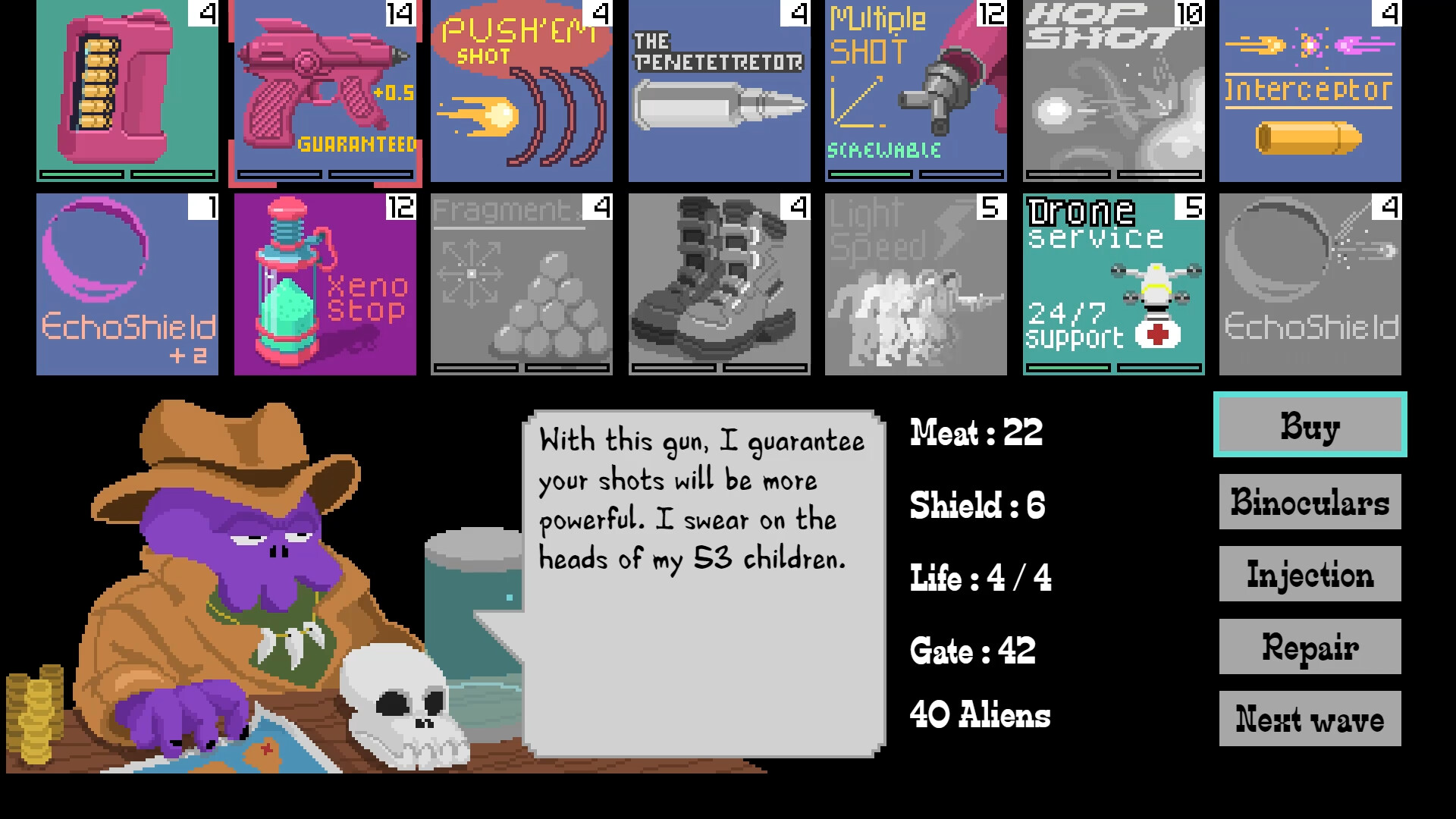 • Mejorad vuestro equipamiento y armas gracias a la carne recolectada (disparo disperso, disparo rápido, dash, escudo, dron de curación, botas antideslizantes, etc.). Algunas mejoras permiten contrarrestar las particularidades de ciertos enemigos, haciendo que la elección de las armas sea estratégica según el número y el tipo de enemigos a enfrentar.
