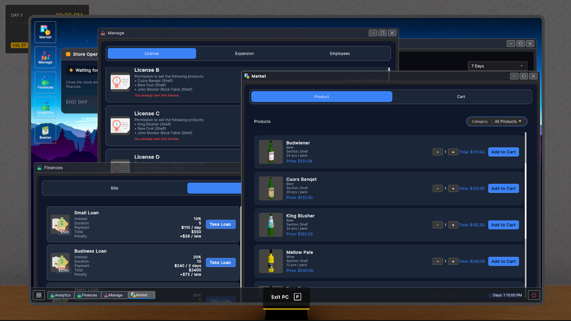 Run, manage, and grow your own liquor empire in a dynamic market where prices change daily, trends shift overnight, and your reputation lives — or dies — on social media.