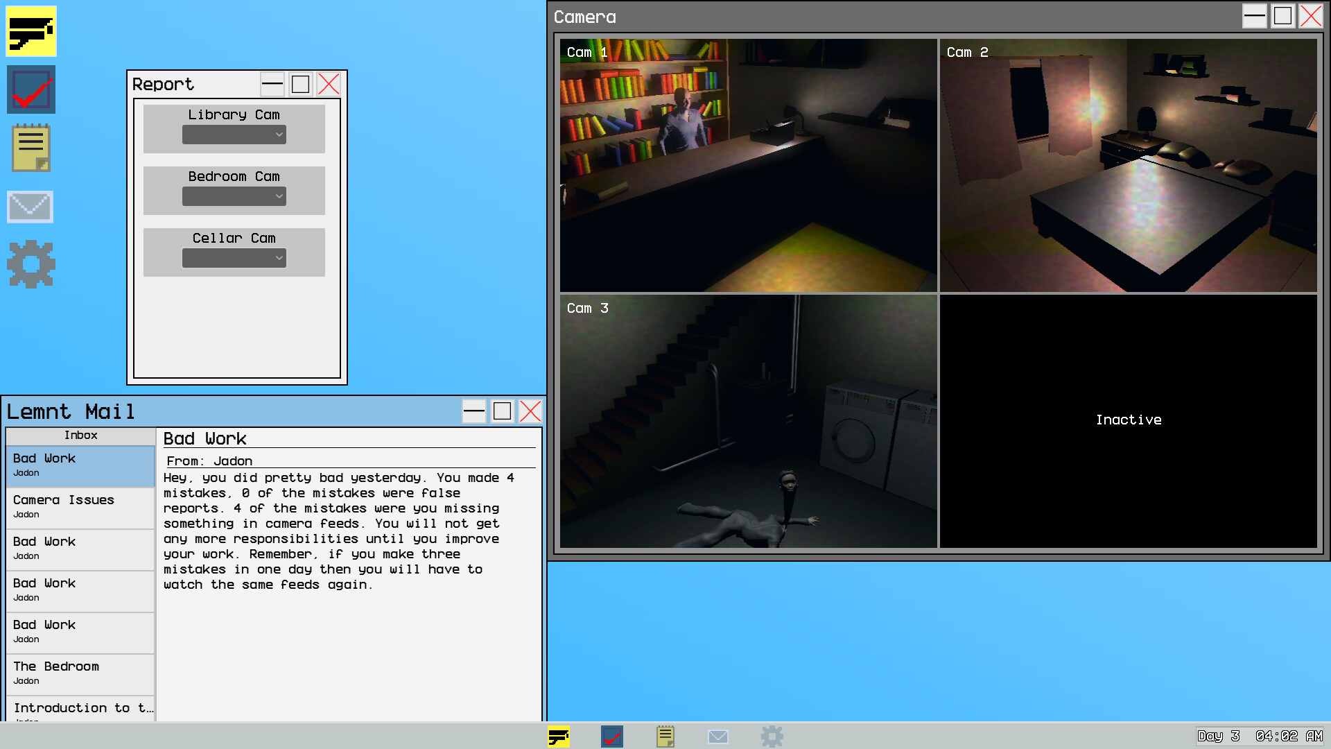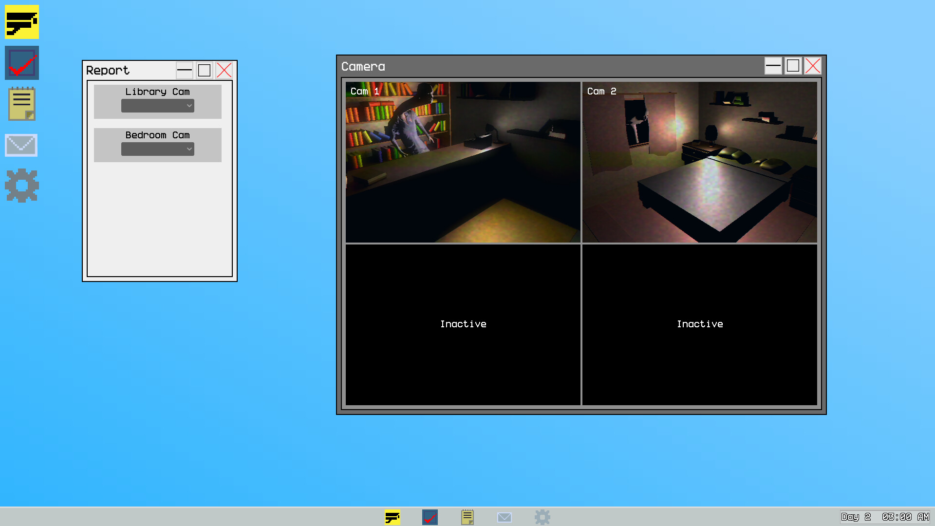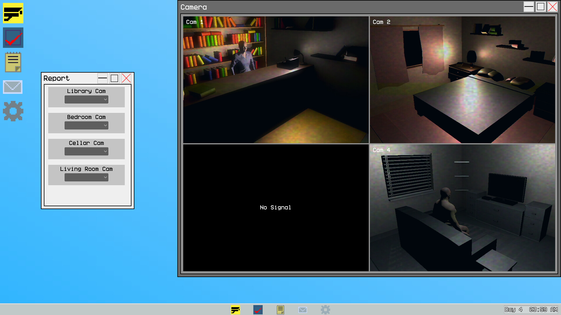 A psychological horror game that takes place in an aging desktop where you have to monitor surveillance feeds. Your job is to report any feeds that show unnatural activity while restarting the cameras to keep them active. Become the best employee.