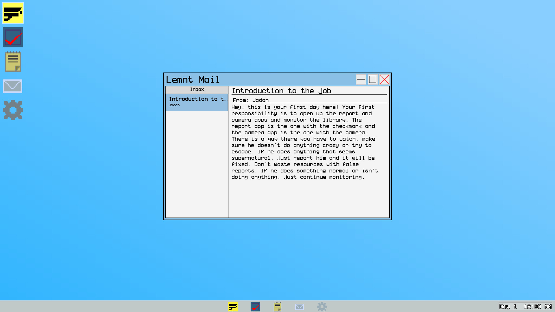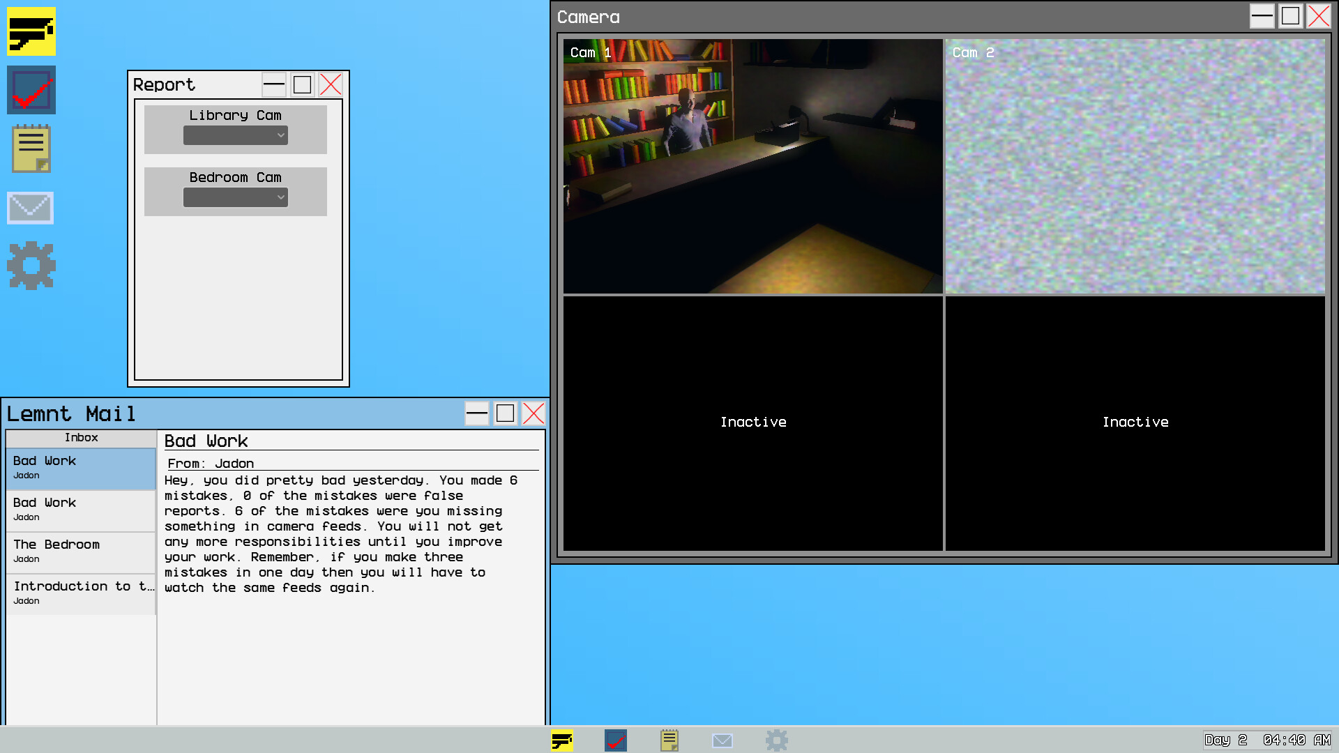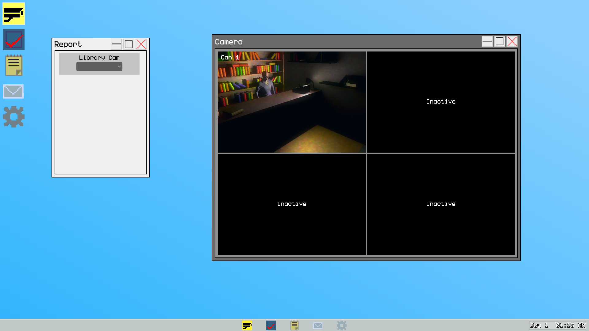 A psychological horror game that takes place in an aging desktop where you have to monitor surveillance feeds. Your job is to report any feeds that show unnatural activity while restarting the cameras to keep them active. Become the best employee.