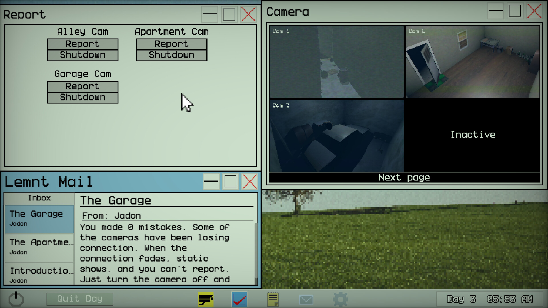 A psychological horror game that takes place in an aging desktop where you have to monitor surveillance feeds. Your job is to report any feeds that show unnatural activity while restarting the cameras to keep them active. Become the best employee.